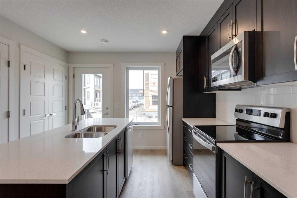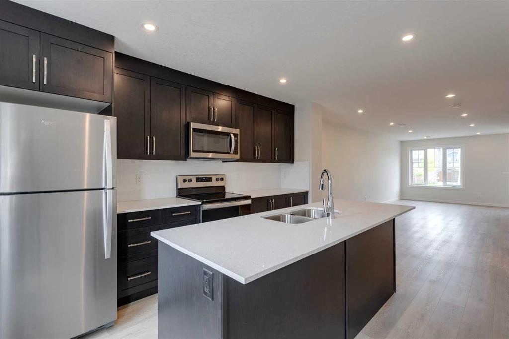 *QUICK POSSESSION* Welcome to the Ambrosia at ZEN Livingston – a stylish, energy-efficient townhome built by a NET ZERO builder! Offering 1,095 sq ft of thoughtfully designed living space, this 2 BED, 2.5 bath home features TRIPLE-PANE windows, advanced insulation, and a rough-in for solar panels – all contributing to lower utility bills and year-round comfort. The OPEN CONCEPT main floor showcases Nuova Luxury VINYL PLANK flooring, pot lights with knock-down ceilings, and a BRIGHT LIVING AND DINING area that flows into your WEST FACING BACKYARD that is FULLY FENCED, perfect for those with kids, pets or wanting to enjoy some privacy — complete with BBQ GAS LINE, landscaping, and irrigation. The modern kitchen includes dark diavik QUARTZ COUNTERTOPS and a 6-piece Whirlpool appliance package. Upstairs, you\'ll find two spacious bedrooms including a primary suite with an ensuite bathroom, upstairs laundry and an additional 4-pc bath. Enjoy HARDIE BOARD siding (hail/fire-resistant), and be part of a vibrant community just steps from the Livingston Hub with splash park, rink, courts & more! Quick access to Stoney Trail (3 min), YYC Airport (13 min), and CrossIron Mills (11 min). AIRBNB friendly! *2ND PARKING STALL may be available for purchase* Some photos are representative. Visit the showhome at 56 Livingston Parade NE for more details!