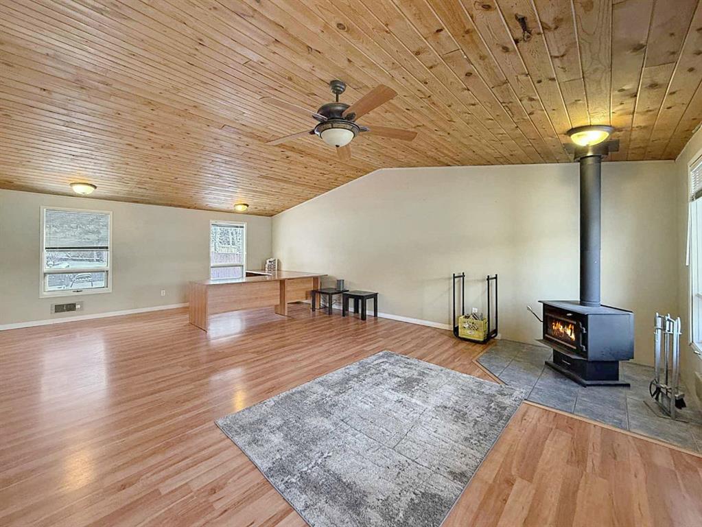 Just off the dining room is a bonus room that can serve as a relaxed secondary living area or a games room for the kids, complete with a wood-burning fireplace for those cozy winter days. The main level also features three bedrooms, a full 4-piece bathroom, and a convenient 2-piece ensuite.