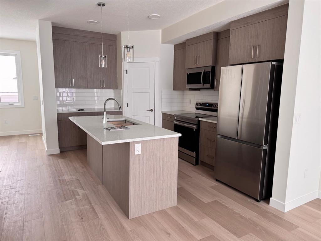 *OPEN HOUSE SAT & SUN 12–3* Builder incentive included: free basement development with purchase. Welcome to this brand new two storey duplex offering over 1,300 square feet of thoughtfully designed living space with 3 bedrooms and 2.5 bathrooms. With a fully developed basement included by the builder, this home delivers exceptional value right from day one. Built with modern finishes and a functional layout, it is well suited for first time buyers, families, or investors seeking long term value. The main floor features 9 foot ceilings and an open concept design filled with natural light. The kitchen is both stylish and practical, featuring quartz countertops in the kitchen and bathrooms, a large central island, and modern cabinetry. Durable vinyl plank flooring runs throughout the main level, while carpet adds comfort to the upper bedrooms. Upstairs, the primary bedroom includes a generous closet and a private 3 piece ensuite. Two additional bedrooms and a full bathroom complete the upper level, offering flexibility for family, guests, or a home office. A separate side entrance enhances functionality and adds versatility for the fully developed basement. Triple pane windows improve energy efficiency and year round comfort throughout the home. Outside, the property offers rear lane access and a detached double garage. Located close to parks, playgrounds, walking paths, schools, shopping, and major routes, this home delivers modern design, efficient use of space, and everyday convenience.