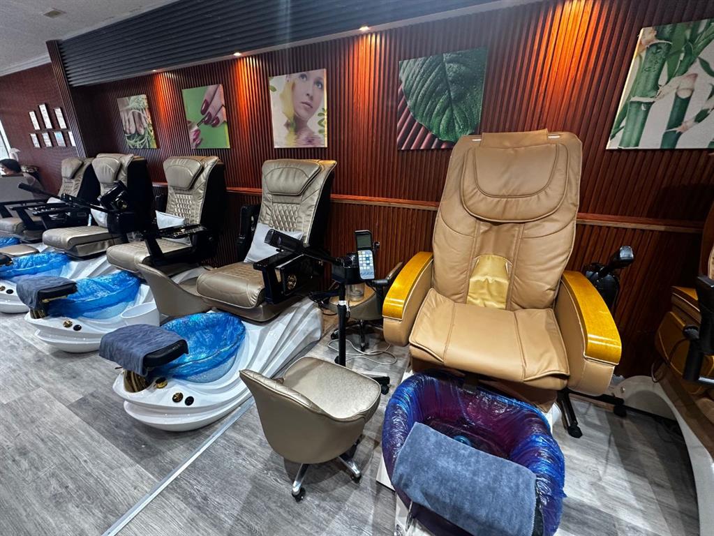The functional layout includes three private treatment rooms, including one oversized room suitable for couple massage, seven nail stations, and six footbath spa chairs, offering excellent operational flexibility. Additional features include two bathrooms (one with a shower), a dedicated washer and dryer room, as well as a kitchen and storage area to support day-to-day operations.
