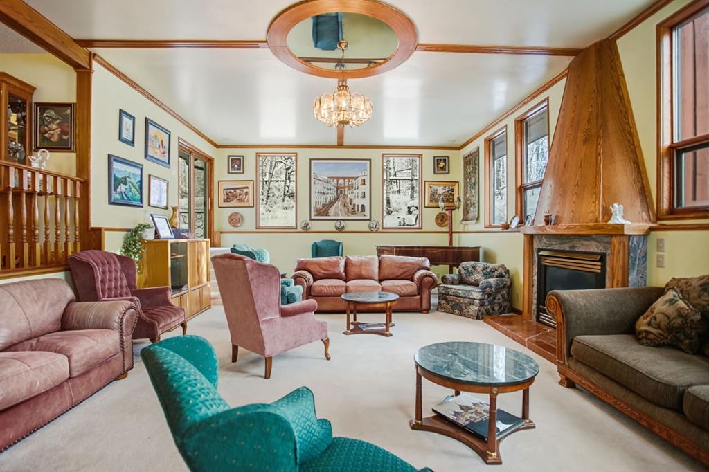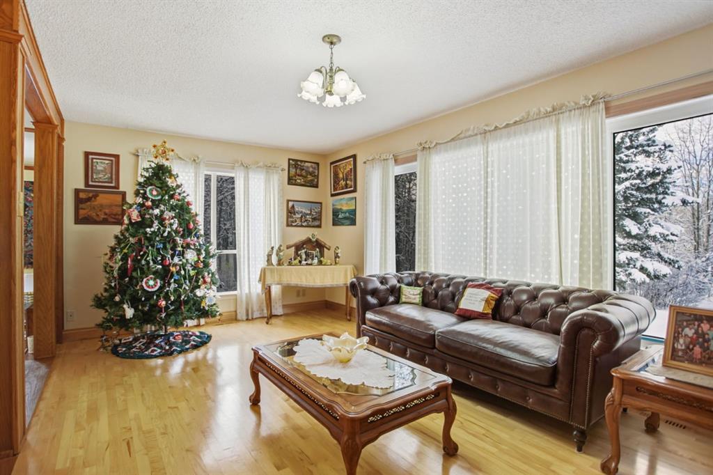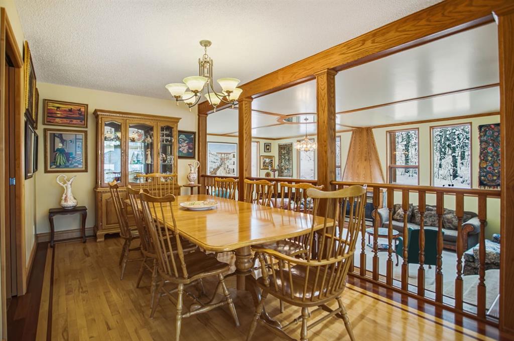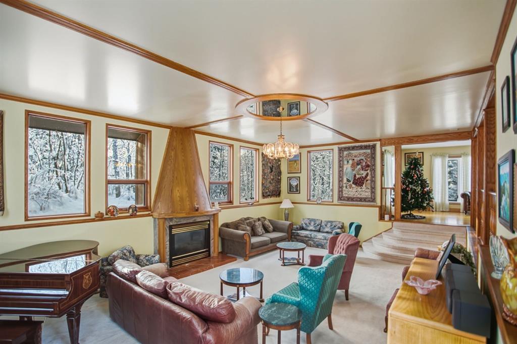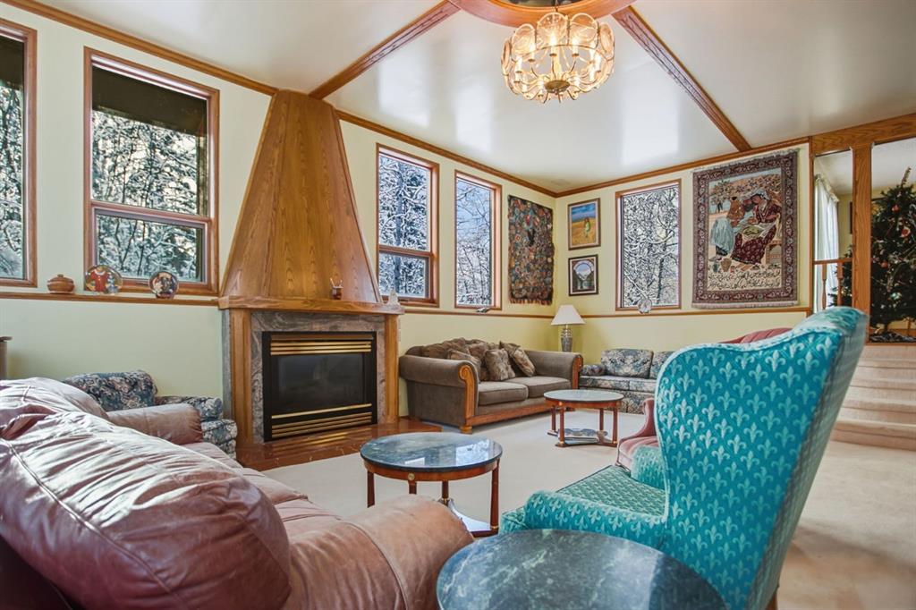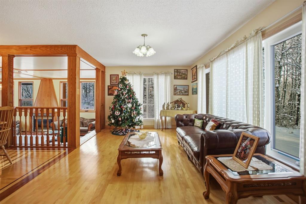 Set in a PRIME LOCATION just minutes from Calgary and close to excellent schools, this exceptional family home offers space, privacy, and a lifestyle that’s increasingly hard to find. With over 4,550 square feet of fully developed living space, this property is designed to accommodate large or growing families, multi-generational living, and memorable entertaining. The home features six generously sized bedrooms, including a huge, primary suite complete with patio doors leading to a large west-facing balcony—the perfect spot to unwind and enjoy evening sunsets. Two fireplaces—one wood-burning and one natural gas—add warmth and character throughout the home. At the heart of the home is a magnificent SUNKEN GREAT ROOM spanning approximately 525 square feet, luxuriously carpeted and rich wood accents. This impressive space with its COZY FIREPLACE is ideal for hosting family gatherings, celebrations, or simply enjoying everyday living on a grand scale. The access to the back patio makes this space perfect for entertaining inside and out. The Great Room is part of the main floor but because it is sunken, it is not counted as part of the total upstairs square footage. The updated kitchen features granite countertops, a BEAUTIFUL CERAMIC-TILED floor, and updated appliances - perfect for large gatherings or simple family meals. Hardwood, ceramic tile, and carpeted flooring throughout provide both durability and comfort. The fully developed basement includes a summer kitchen, offering excellent flexibility for extended family, guests, or entertaining and a massive 6th bedroom that could also be used as a rumpus-room for games or workouts.. Outside, the acreage setting truly sets this property apart. A large, level grassed area offers space for a private soccer pitch or multi-sport play, while the wooded eastern portion of the property adds privacy and a natural buffer. Wildlife—including deer, moose, and a wide variety of birds—are frequent visitors, creating a peaceful, nature-rich environment. Additional highlights include an under-drive double garage, paved road access to the driveway, and a quiet, private setting that still offers easy access to Calgary and nearby amenities. An outstanding opportunity to enjoy acreage living without sacrificing space, comfort, or convenience—this is a home built for family, entertaining, and lasting memories.