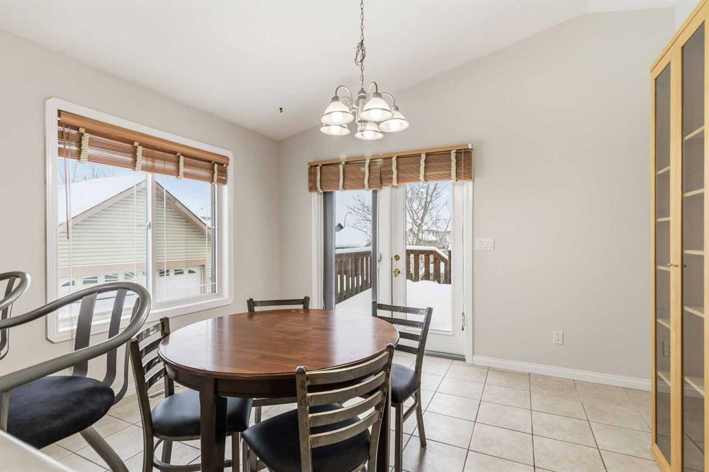 Upon entry, you’re greeted by high vaulted ceilings, a generous front foyer, and the convenience of main-floor laundry. The open and inviting living space features hardwood flooring and a cozy corner gas fireplace, creating a warm atmosphere for everyday living. Fresh paint throughout the home adds a bright, updated feel. The kitchen is designed with functionality in mind, offering an abundance of cabinetry and counter space, ample natural light, and a seamless flow into the dining area with direct access to the back deck—perfect for outdoor enjoyment.