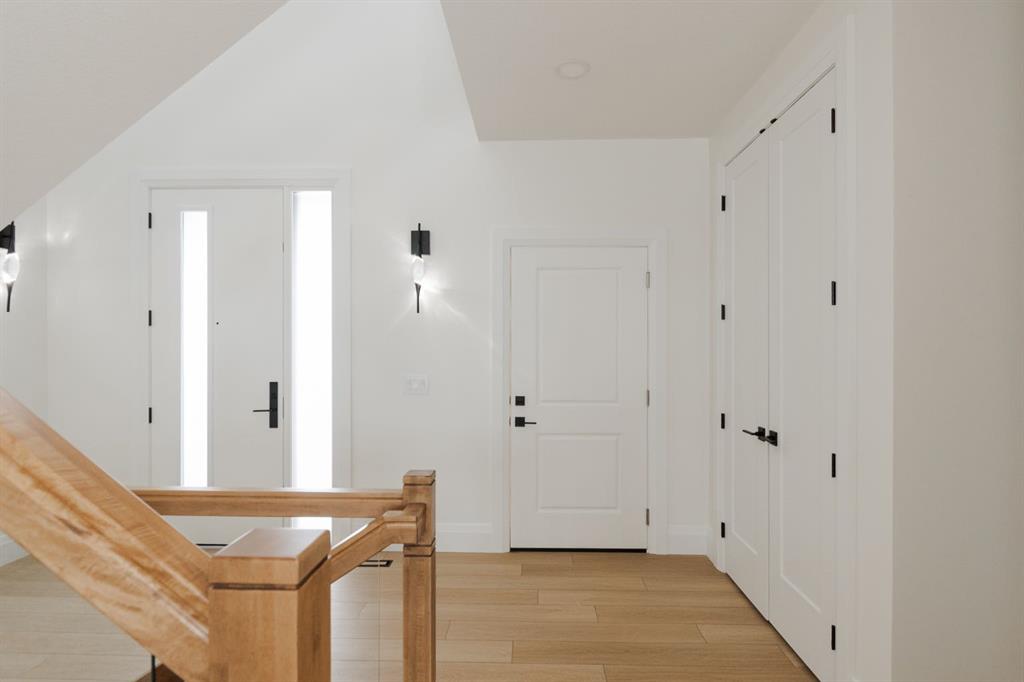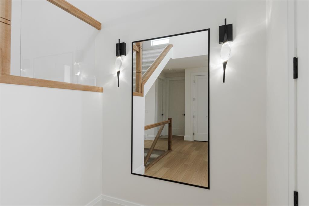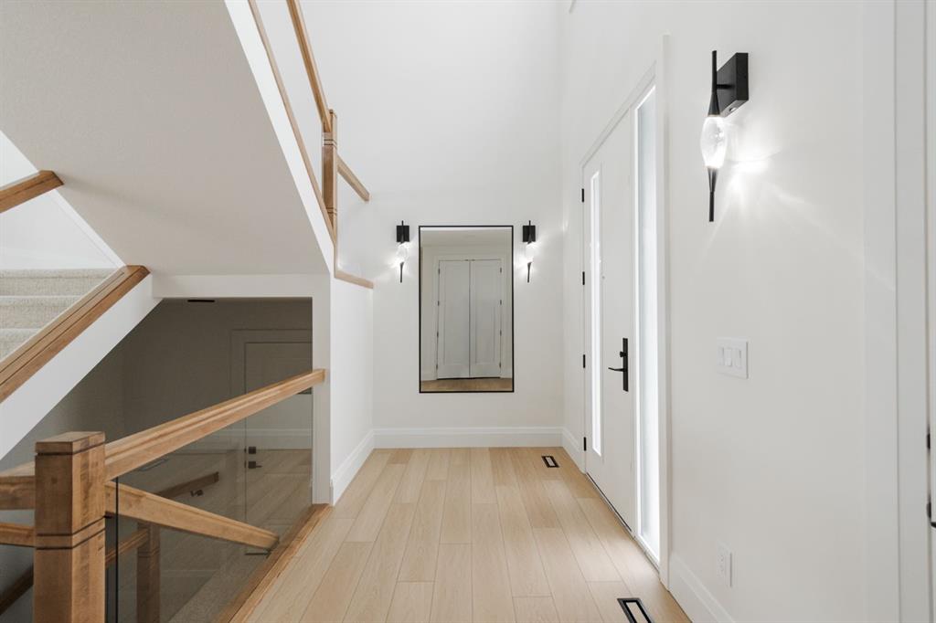 Inside, the attention to detail is evident from the moment you step through the door. A spacious entry with soaring ceilings, a modern chandelier, wall sconces, and a built in mirror sets the tone for the design throughout. Nine foot ceilings span all three levels, paired with eight foot interior doors on both the main and upper floors to create a bright, open, and elevated feel. Oversized modern windows bring in abundant natural light, highlighting the clean lines and thoughtful finishes.