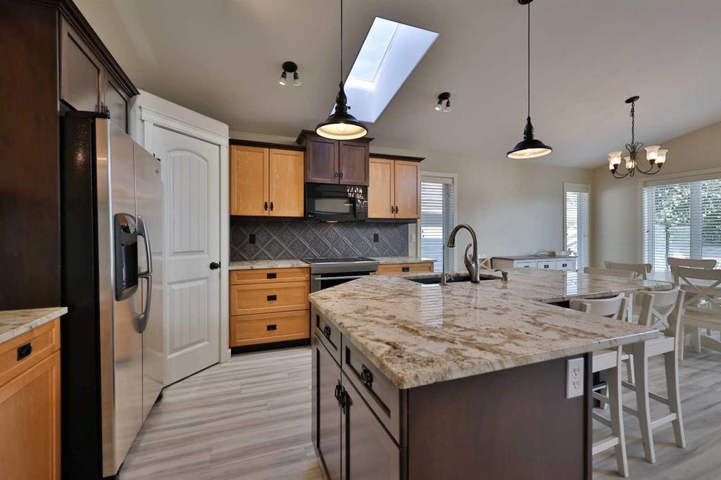 Welcome to 74 Rivermont Crescent W — a stunning, designed and custom-built bi-level tucked away on a quiet street in West Lethbridge! With 5 bedrooms plus an office, this walk-out home offers all the space your family needs and more. Overlooking peaceful green space, it’s only a couple of minutes walking up the crescent to a park featuring a stocked fishing pond and deck, a premium playground, and scenic nature trails. Coulee trails and an off-leash dog park are within walking distance too! Step inside to a bright, open-concept main floor featuring quartz countertops, updated flooring, skylight, and oversized windows that flood the space with natural light. The spacious primary suite comes complete with a walk-in closet and a 4-piece ensuite with double sinks and a relaxing jetted tub. The fully finished walk-out basement is filled with natural light and includes extra bedrooms, a full bathroom, and an office that could serve as a 6th bedroom. A focal gas fireplace and a ready hook-up for a projector make it the perfect spot for cozy family movie nights. Outside, enjoy a large furnished patio with an outdoor propane fireplace and a ready-to-use hot tub that all stay with the home. The fenced, professionally landscaped backyard showcases mature trees, a perennial garden, and underground sprinklers. Add in two beautiful fountains, central A/C, and a double attached garage, and this home truly has it all! Don’t miss your chance to own this incredible property in one of West Lethbridge’s most desirable neighborhoods!