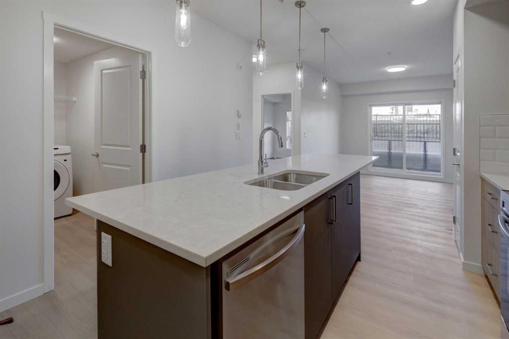 INTRODUCING GLACIER RIDGE, IN BEAUTIFUL NORTHWEST CALGARY. BUILT BY CEDARGLEN LIVING, WINNER OF THE Customer Insight BUILDER OF CHOICE AWARD, 6 YEARS RUNNING! BRAND NEW \"GR04\" unit with high-spec features. You will feel right at home in this well thought-out, 588.10 RMS sq.ft. 1 bed, 1 bath home with open plan, 9\' ceilings, LVP flooring throughout (NO CARPET), Low E triple glazed windows, BBQ gas line on the patio, Fresh Air System (ERV), A/C rough-in, and so much more. The kitchen is spectacular with full height, two tone cabinets, quartz counters, upgraded bank of drawers for pots and pans, undermount sink, rough-in water line to the fridge and S/S appliances. The island is extensive with built in flush breakfast bar, which transitions into the spacious living area, perfect for entertaining. The spacious primary bedroom has a large bright window (triple pane windows) and sizeable walk-in closet. Right beside your bedroom is a 4pc bath with quartz counters, upgraded tiles to the ceiling, and undermount sink. Nearby is the spacious laundry/storage room, this is a must see (washer & dryer included). Highlights include: Hardie board siding, designer lighting package, sound reducing membrane to reduce sound transmission between floors, clear glass railing to balconies and 1 titled underground parking stall included. A once in a lifetime community in Northwest Calgary. Framed by views of the Rocky Mountains and distinguished by natural coulees that cross the land, Glacier Ridge offers a rare chance for families to live in a new community. PET FRIENDLY COMPLEX, IMMEDIATE POSSESSION AVAILABLE AND DON\'T FORGET TO CHECK OUT THE VIRTUAL TOUR.