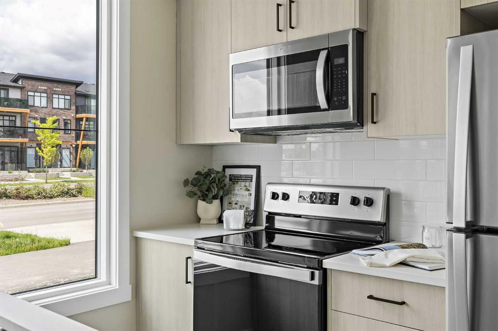 Introducing Meridian by Brookfield Residential, located in the heart of Livingston! This 1-bedroom, 1-bathroom townhome offers the perfect combination of convenience and comfort. CURRENT PROMOTION: Choose 2 OF 3 (your choice): (1) FREE A/C, (2) FREE condo fees for 2 years, or (3) $5,000 towards window coverings! This property includes a gas line to BBQ, Island Pendants, cabinet crown + riser and interior selections upgrades! Situated in a highly desirable neighbourhood, it’s just moments away from a wide range of amenities, making it an excellent choice for first-time homebuyers or investors. The ‘Coltrane’ model features a thoughtfully designed open-concept layout, complete with luxury vinyl plank flooring throughout the living spaces and bedroom (no carpet). The large west-facing windows at the front of the home invite abundant natural light, creating a bright and welcoming atmosphere all day long. The kitchen overlooks the living and dining areas, making it ideal for hosting friends and family. The kitchen is beautiful and functional, featuring stainless steel appliances, quartz countertops, full-height cabinets, and a pantry. The spacious peninsula island offers additional seating and storage options. The generous primary bedroom comes with a large closet and windows that look out onto the patio. A 4-piece bathroom and a utility room with in-suite laundry and extra storage complete the home, offering convenience and practicality. Completing the unit is a title parking stall. Situated in Livingston, a vibrant new community, this townhome is within walking distance of parks, playgrounds, the Livingston Homeowners Association, a dog park and numerous other amenities. With easy access to major routes, this property presents an opportunity that shouldn\'t be missed. **Please note: The photos provided are of a previous home and may not represent the property for sale, finishes may vary.