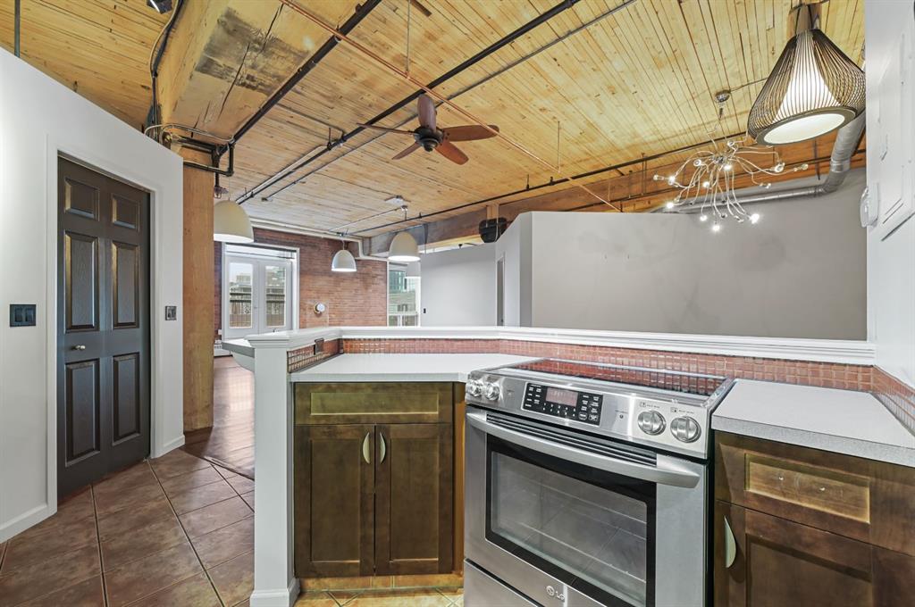 West-facing exposure fills the space with warm afternoon light through expansive windows and a Juliette balcony off the living area, creating an inviting atmosphere and showcasing downtown energy. The open-concept layout highlights original fir wood ceilings, exposed beams, brick walls, and visible piping—architectural elements that give the loft its authentic character.