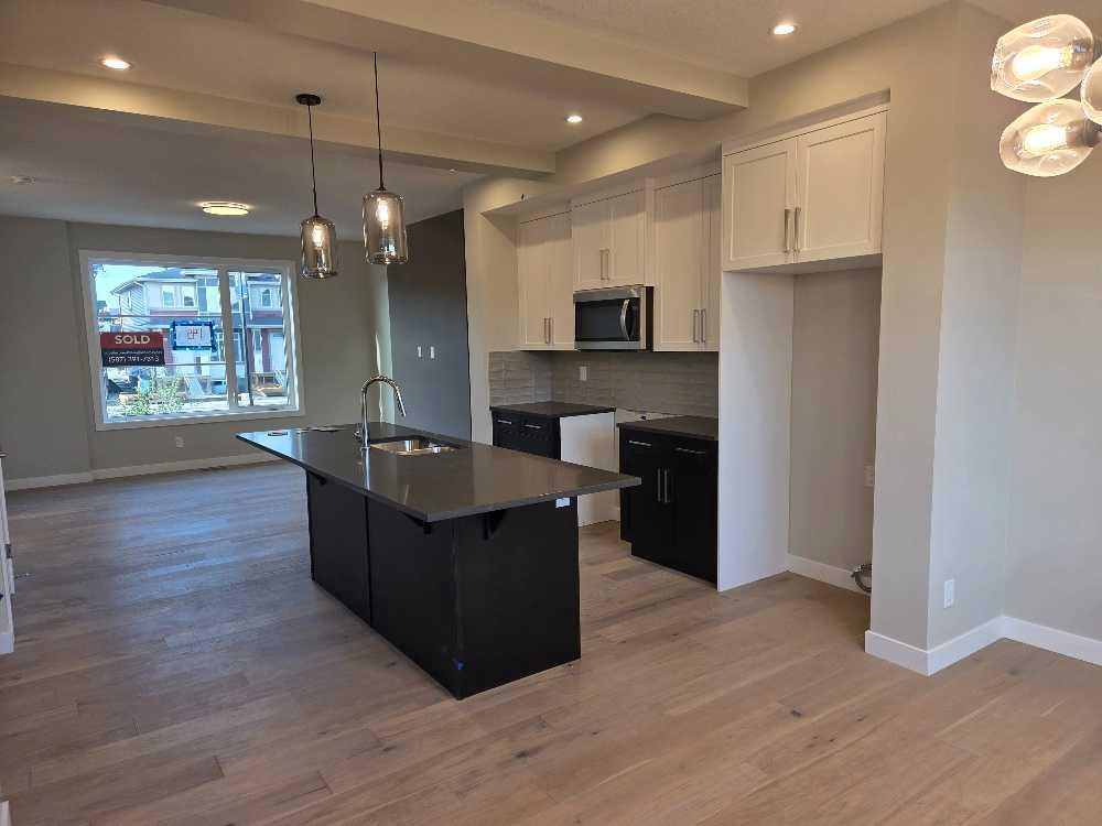 Public Remarks: IMMEDIATE POSSESSION. ,DOUBLE DETACHED GARAGE, DECK, FENCED AND LANDSCAPED, NO CONDO FEES. SOME PICTURES ARE OF SIMILAR MODEL, Welcome to the \"St. Andrews\" townhome, by Award winning, Master Builder, Douglas Homes Ltd. From the front covered porch, the entry opens onto the spacious great room with 9ft ceiling and gleaming hardwood floors throughout the main floor. The aspiring chef will appreciate the well planned \"island\" kitchen. From the upgraded 42 inch, soft close cabinets, to the gorgeous quartz countertops, everything is within easy reach. The sparkling stainless steel fridge, the glass top, self cleaning electric range, dishwasher, and over the range microwave/hoodfan are all just an arms length from the kitchen sink. Opposite side of the island, provides a convenient pantry, and desk with upper cabinet for all those recipe books you will collect. The spacious dining area features a large picture window looking out upon the back yard with room for the kids to play, with a rear entry door to the deck for those summer bbq\'s. Here also is a 2pc powder room for your guests convenience, and perhaps the kids hurried need. Upstairs includes 2 good sized secondary bedrooms, a 4pce bathroom with quartz vanity and tile floors, a convenient upstairs laundry, and a spacious primary bedroom with large upsized window and ensuite bath, with walk in shower, with glass front, tile floor and again a quartz vanity. The full basement provides rough in plumbing for a future bath, one window for future bedroom, and enough space remaining for a spacious future family room if you decide your family needs room to spread. All this in the desirable new subdivision Cobblestone Creek, with tennis courts, playgrounds, future school reserve, pathways and numerous green spaces, on the western edge of Airdrie, with wide open country side, and views to the west.