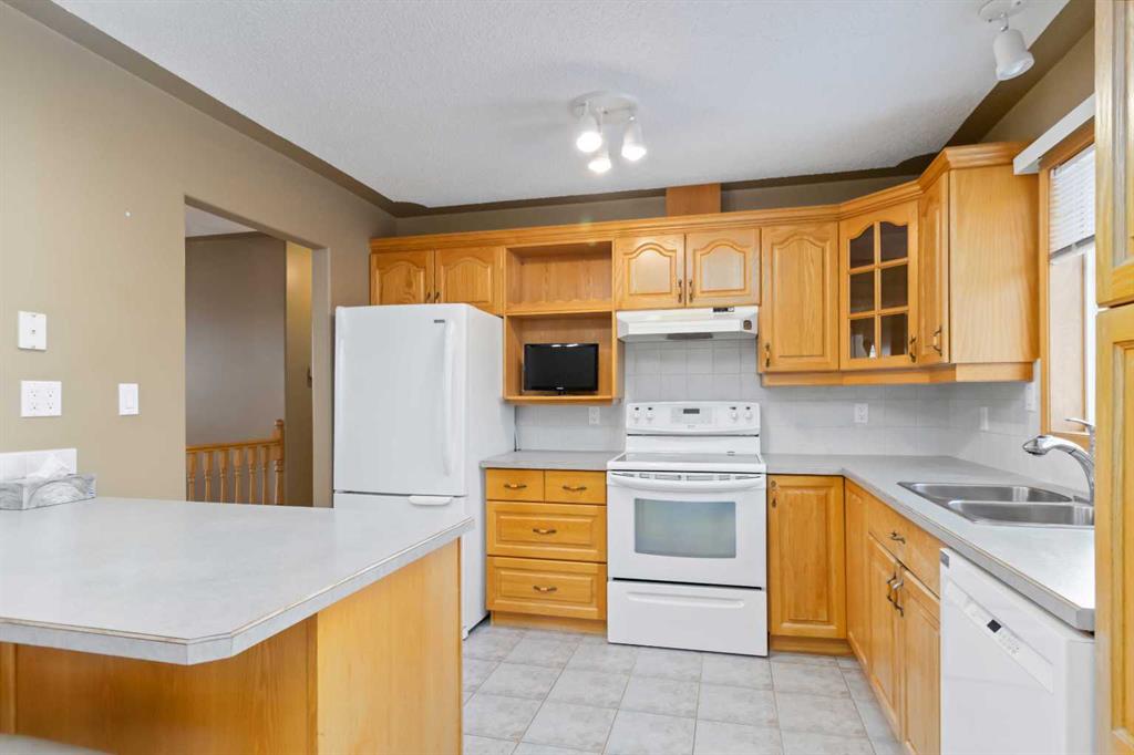 The kitchen offers oak cabinetry, a large window overlooking the backyard, and a convenient sit-up island with added storage; ideal for the family chef and helpers alike. Also on the main floor is the generously sized primary bedroom, complete with a walk-in closet and a full 4-piece ensuite featuring a jetted tub. Two additional bedrooms with large backyard-facing windows complete the upper level.