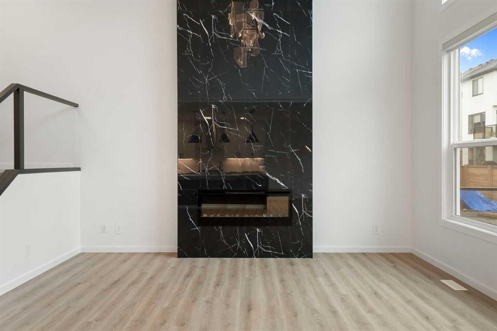 From the moment you step inside, you’re greeted by a bright, open-concept floor plan highlighted by soaring ceilings, expansive windows, and sleek contemporary finishes. The main level includes a stylish glass-enclosed home office—perfect for remote work or homework—and a spacious great room anchored by a dramatic two-storey black marble feature wall. Luxury vinyl plank flooring adds both beauty and durability throughout.