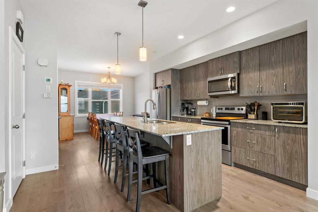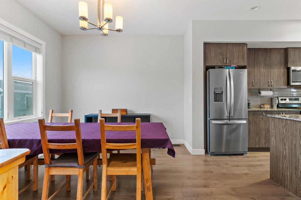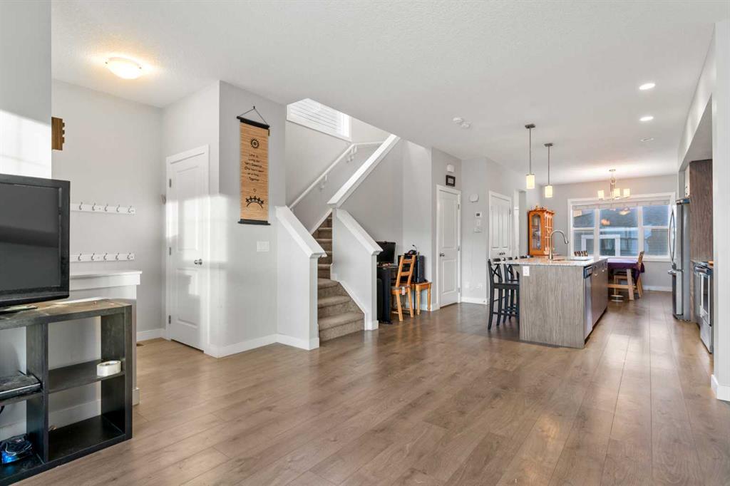 Welcome to this modern, no condo fee, fully developed, end-unit townhome, built in 2019 by Shane Homes. Offering a separate side entrance for a potential secondary suite (with city of calgary permits and approval), this home presents an exceptional opportunity for multi-generational living or future rental income. The main floor welcomes you with a spacious front entry leading into a bright, open-concept living, kitchen, and dining area. The modern kitchen features contemporary cabinetry, quartz countertops, a large eat-up island, pantry, and stainless steel appliances. A convenient 2-piece bathroom and a generous boot room with direct access to the fully fenced backyard and double garage complete the main level. Upstairs, the second floor offers a laundry room, three well-appointed bedrooms, including a spacious primary retreat with a walk-in closet and private ensuite bathroom. The fully developed basement, completed by the builder, continues the home’s cohesive design and modern finishes. This level includes a large bedroom, 4-piece bathroom, mechanical/storage room and a spacious living/entertaining room, making it ideal for guests, extended family, or future suite potential. The home features a new roof and siding (2025), New washing machine (2025), and additional outlets for furture kitchen/wet bar development in the basement. Cornerstone is an established community offering 95 Acres of land dedicated to parks, 5 access points to easily enter and exit the community, 14 kms of pathways, 5 future school sites, 180 Acres of natural wetlands, Commercial space equipped with major amenities and 3 playgrounds.
