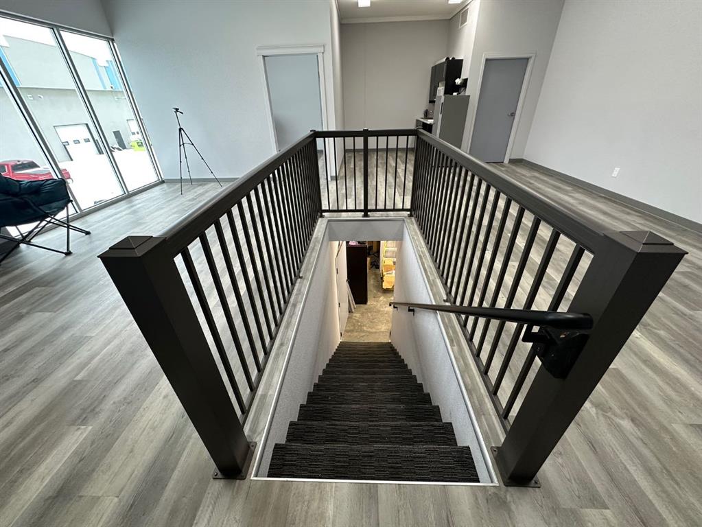This unit features a front showroom/reception area, featuring a wall of windows. There is separation from the rear \'working\' area, which features a 10-foot overhead door, gas heater, 220V electrical plug-in as well as in-floor drain. You will also find two bathrooms and two storage rooms back here. Upstairs is developed to be open and bright, with one private office and a kitchen area with fridge, sink and plenty of cupboard space. There is potential to close in more office spaces, or create open-air cubicles.
