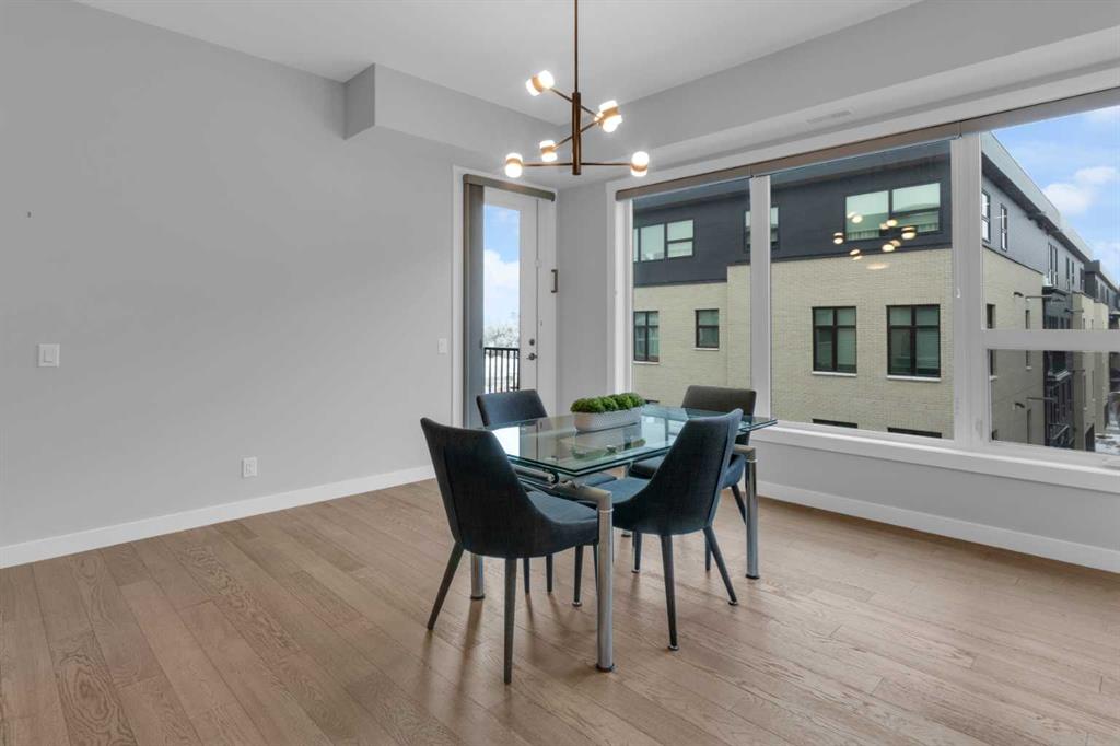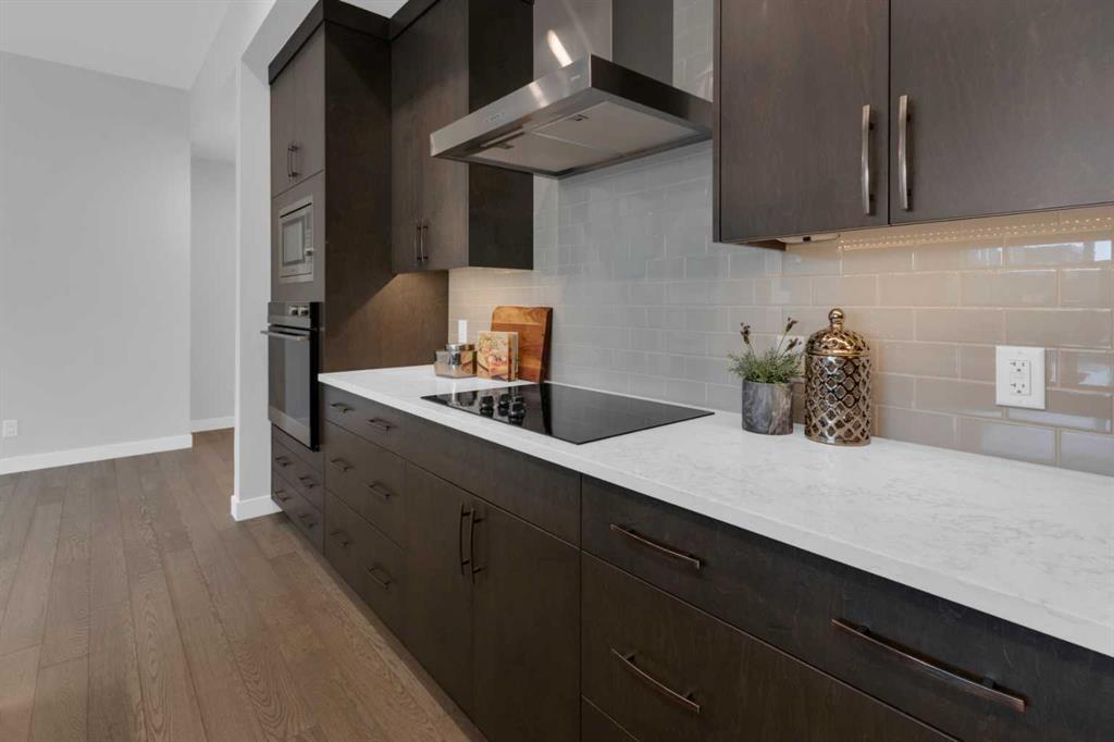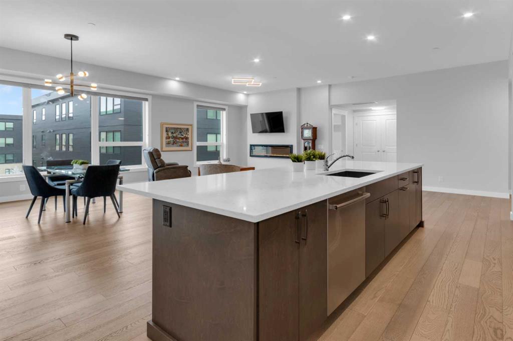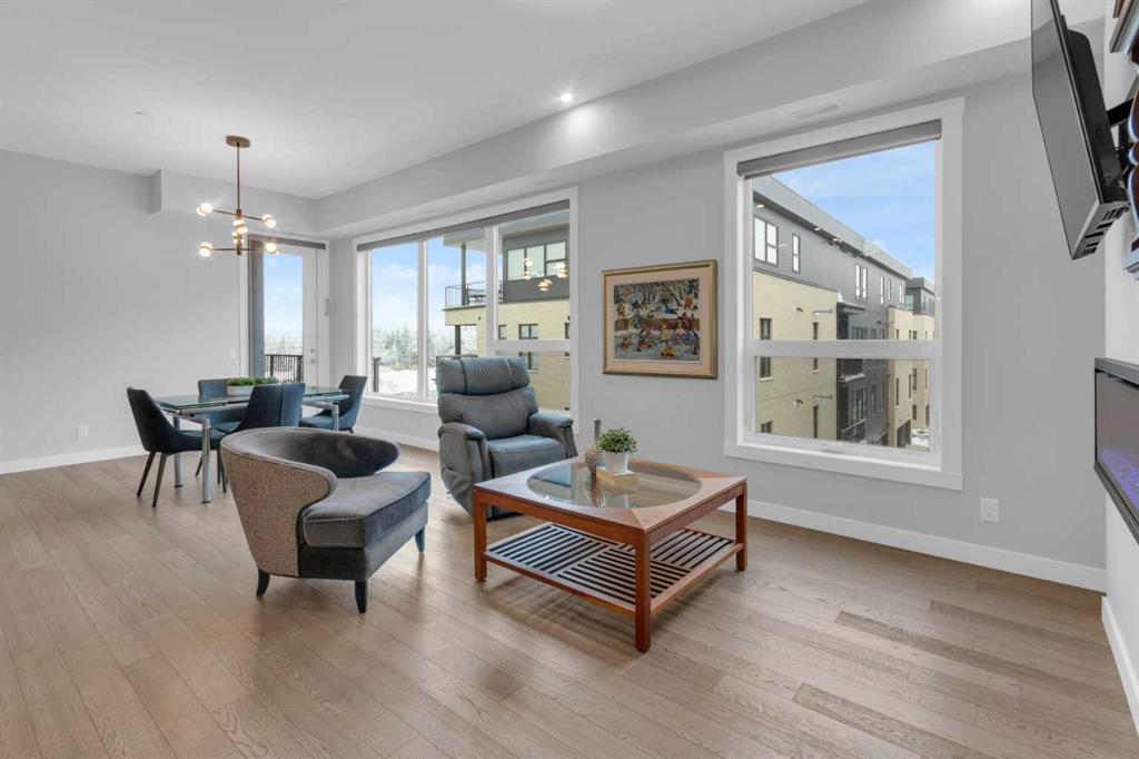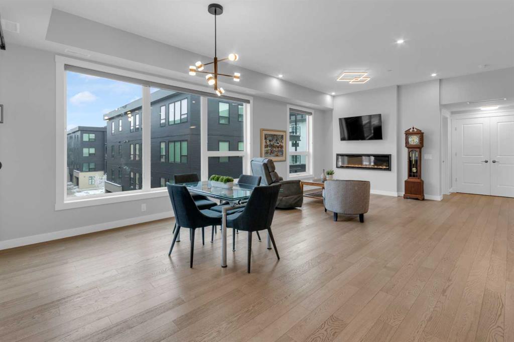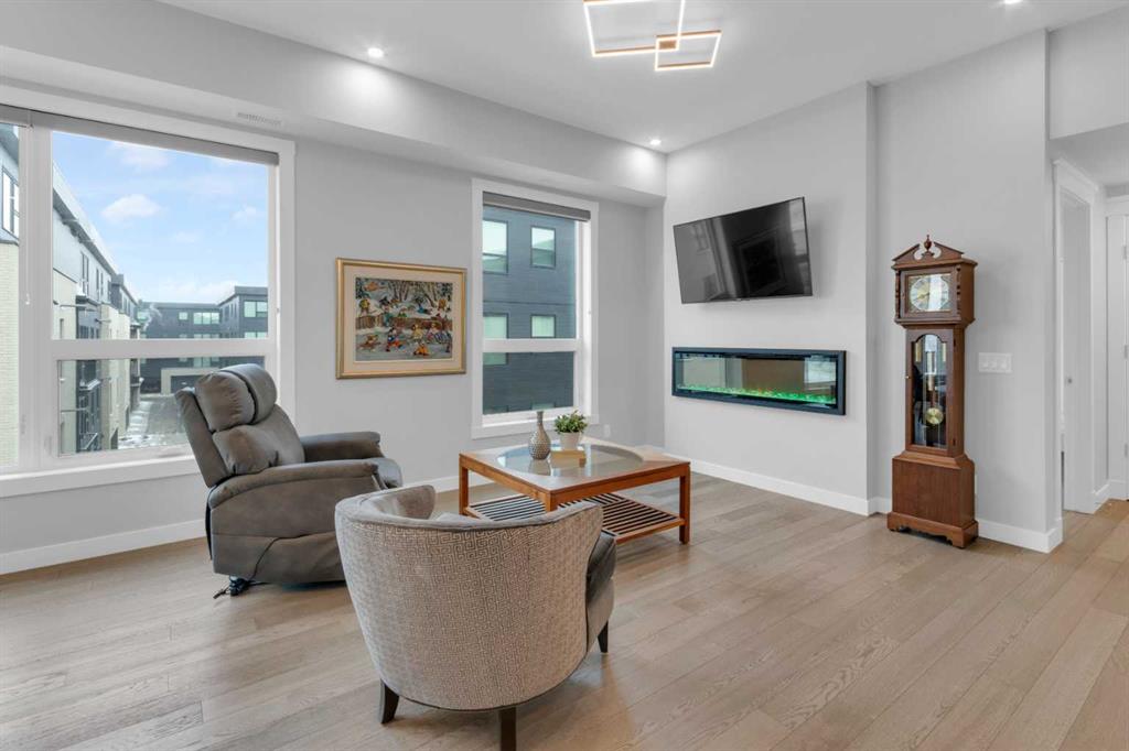 Welcome to Capella in University District, a small condo building with only 8 Estate Style single level luxury homes. This spacious and well laid-out 2 bedroom, 2 bathroom condo with single garage is just steps away from all of the amenities this highly desirable community offers. Located on the third floor is this modern residence with hardwood flooring, 10 foot ceilings, many large windows, central air conditioning, designer bathrooms and well-equipped spacious kitchen. The open concept main living space is flooded with natural light and features a sleek kitchen with expansive island, quartz countertops and full height cabinetry. The kitchen opens directly on to the dining space, the living room with electric fireplace, and a nook that works well for a den/office or as space for additional furniture. The bright primary suite offers enough space for a king size bed, a walk-in closet, and a 5-piece ensuite with heated floors, free standing tub, dual vanity, and fully tiled walk-in shower. The second bedroom has a murphy bed, a full bathroom across the hall, and is located on the other side of the condo from the primary bedroom, providing privacy between the bedrooms. Enjoy the morning sunrise on the spacious east-facing covered balcony that is equipped with a gas line for your BBQ or heater and a water line. The private, heated singe garage is attached to the building has epoxy floors, storage space, and a water softener for the condo unit. This well cared for building is part of a 7 building complex that offers a fitness centre, visitor parking, and courtyard spaces. Conveniently situated within walking distance to a grocery store, restaurants and coffee shops. Steps away from Market Mall, the U of C and the Children\'s Hospital and a quick commute to downtown and access out to the mountains.