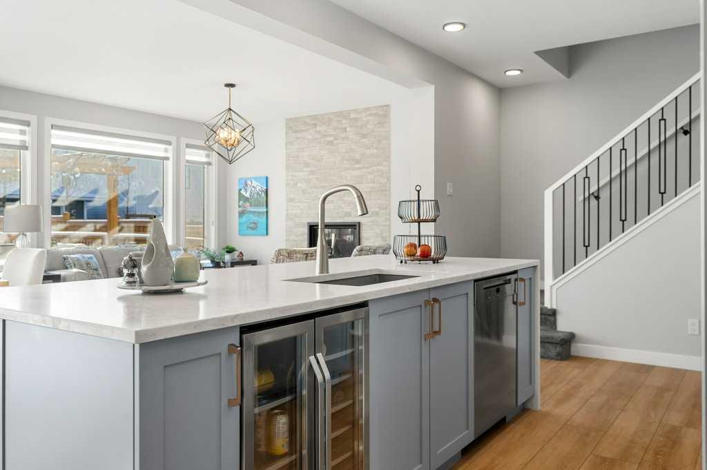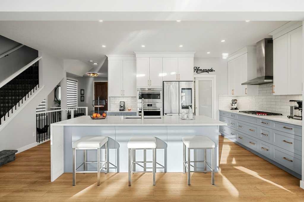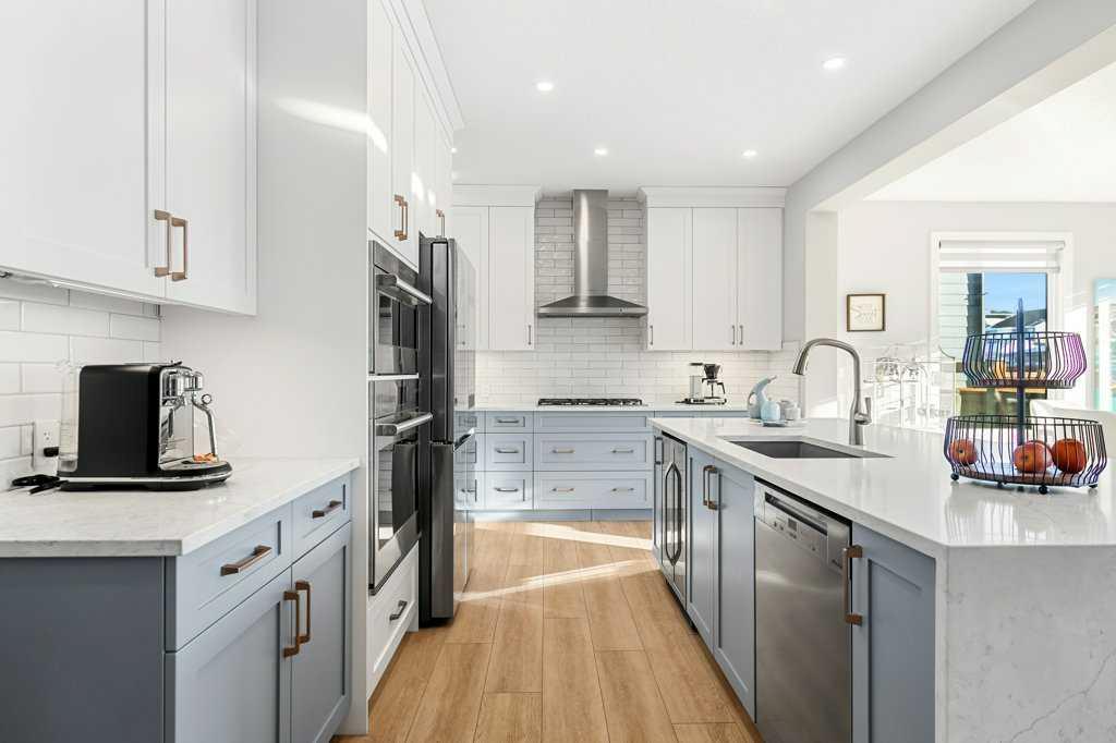 The main floor is thoughtfully designed with 9’ knockdown ceilings, LVP flooring, silhouette blinds, and a stunning floor-to-ceiling stone fireplace anchoring the living area. The chef’s kitchen is a showstopper with white perimeter cabinetry and a light grey waterfall island, quartz countertops, soft-close cabinetry with crown molding, dovetail drawers, gold accents, pot lighting, and a Silgranite sink. Premium appliances include a Wolf 5-burner gas cooktop, chimney hood fan, built-in Wolf speed oven and wall oven, Miele dishwasher, Samsung smart refrigerator, and bar fridge. A walk-through pantry with pocket doors connects to the mudroom and garage entry. The mudroom offers dual closets and access to a stylish 2-piece bath, while the large front foyer includes a guest closet and broom storage.
