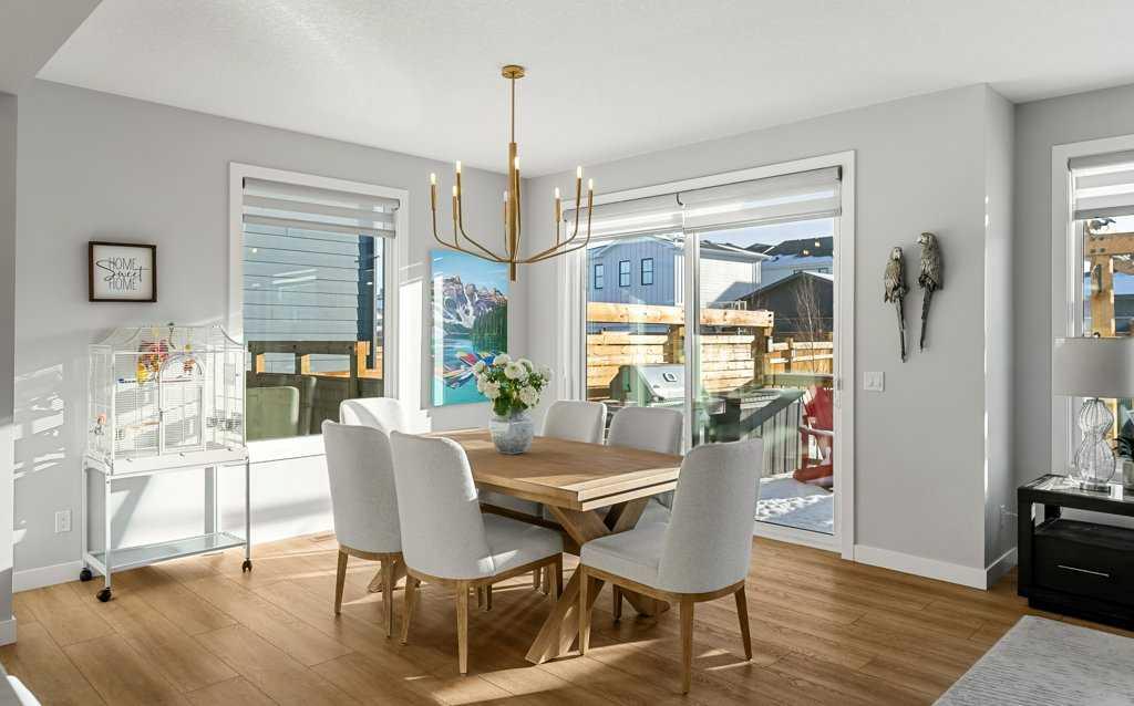 Exceptional Sterling Homes built Allure 3 plan featuring a south-facing backyard and extensive upgrades throughout. The exterior showcases durable Hardie board and stone, with an attached double garage and paved back lane. The oversized, fully fenced yard (approximately 139–135 feet deep) includes a large deck, privacy-side pergola, storage shed, BBQ gas line, and expansive sliding doors that seamlessly connect indoor and outdoor living.