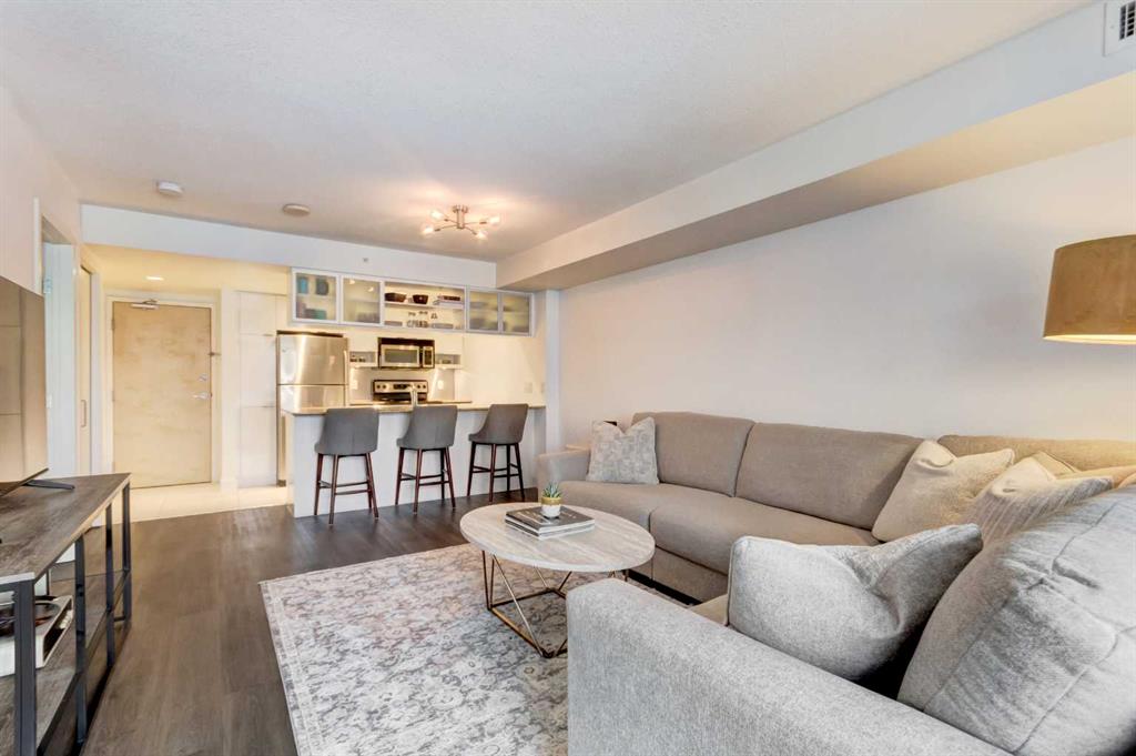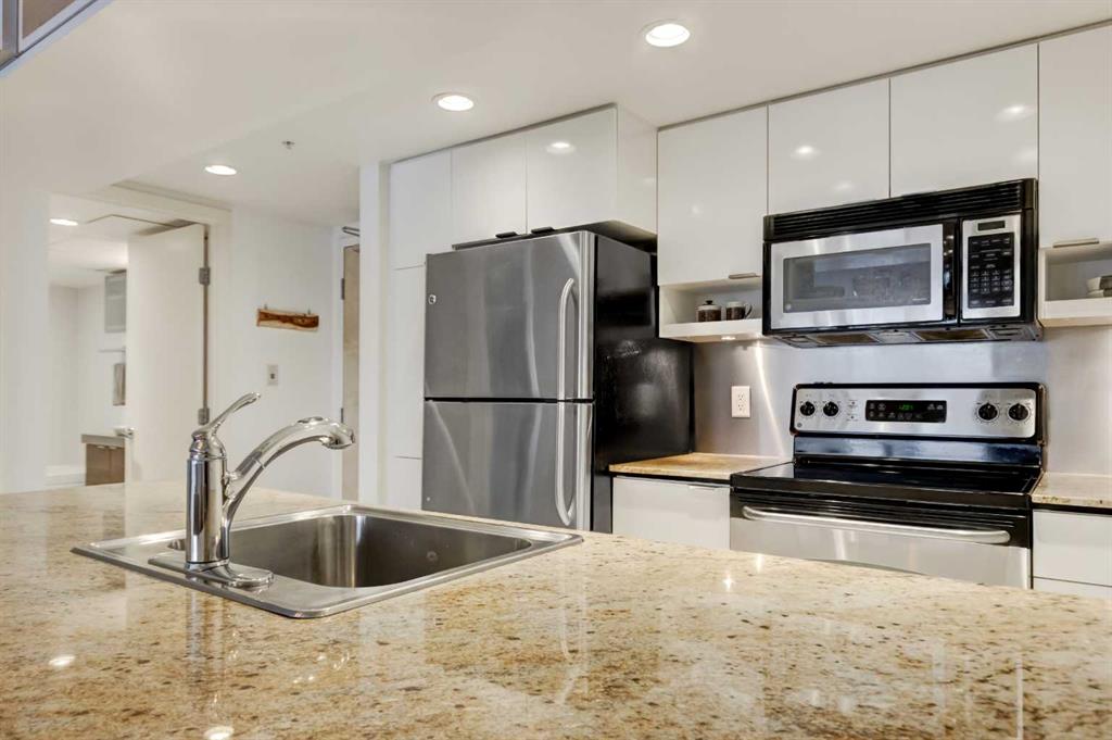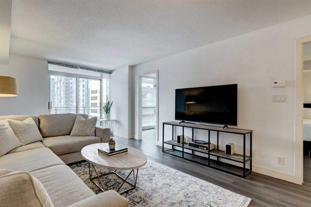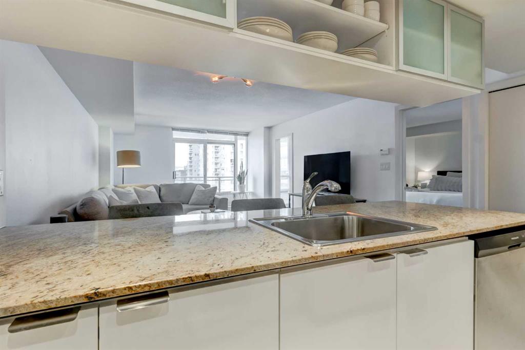 Welcome to this bright & beautifully designed 1-bedroom plus den home featuring a large west-facing balcony that spans the full width of the unit - relax as you watch the sunset! The open-concept layout is filled with natural light, creating an inviting & airy living space. The kitchen offers granite countertops, crisp white cabinetry & an extended eating bar, making it ideal for cooking, casual meals & entertaining. The spacious living/dining room easily accommodates a full dining table, offering flexibility for both daily living & hosting. The king-sized primary bedroom provides comfort & room to spare & the cheater ensuite boasts a soaker tub & separate shower. Imagine working from home in your den that overlooks the balcony through floor-to-ceiling windows & is generously sized to fit a queen bed, making it an excellent guest room, office, or multipurpose space. Located in a well-constructed concrete building, this home features durable vinyl plank flooring, adding style & practicality. Included is one titled underground parking stall & a separate storage locker for added convenience. Residents enjoy an impressive array of amenities, including concierge service, a fitness centre, a guest suite, a social room, & underground visitor parking. All of this is just steps from grocery stores, boutique shopping, restaurants, coffee shops, & pubs—offering an unbeatable urban lifestyle. Welcome home! You’ll love living here!!!