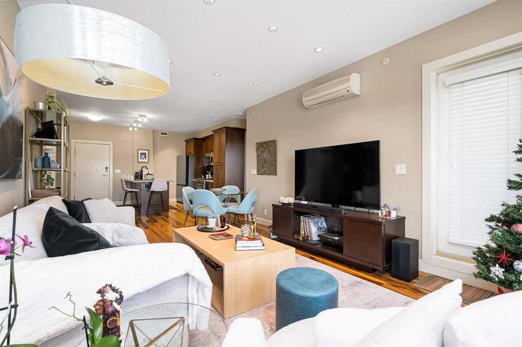 Welcome to this top floor condo in Providence Kensington, ideally located in the heart of Hillhurst, one of Calgary’s most desirable inner city communities. This beautifully maintained 2 bedroom, 2 bathroom condominium offers executive finishes, a functional open-concept layout, and an unbeatable walkable lifestyle, just steps from Kensington shops and restaurants, the Bow River pathway system, public transit, and downtown Calgary. The interior features 9 foot ceilings, Brazilian Tigerwood hardwood flooring, air conditioning, and a warm, modern neutral colour palette. The chef-inspired kitchen is both stylish and practical with walnut cabinetry, granite countertops, stainless steel appliances, a natural gas stove, corner pantry, and an island with breakfast bar, perfect for entertaining. The refrigerator, washer, dryer, and kitchen faucet are all under one year old, offering added value and peace of mind for the next owner. The bright living room opens to a spacious north facing balcony with tranquil views overlooking the St. John Centre and surrounding green space. The thoughtfully designed floor plan places the bedrooms on opposite sides of the unit, ideal for privacy, guests, or a work-from-home setup. The primary bedroom retreat includes a walk-through closet and a generous 5-piece ensuite with dual sinks and an oversized walk-in shower. The second bedroom features a walk-in closet and is conveniently located next to the 4 piece bathroom and insuite laundry. Additional features include one titled underground parking stall, a dedicated storage locker, access to a fitness centre, and a secure bicycle storage room. North facing, top floor condos in Providence Kensington rarely come to market, making this a fantastic opportunity for professionals, downsizers, or investors seeking a premium inner-city Calgary condo. Don’t miss your chance to own in one of Calgary’s most vibrant communities!
