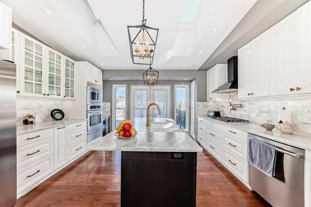 This dream kitchen is thoughtfully designed with a pot filler above the built-in gas cooktop, a dual-temperature beverage and wine fridge tucked beneath the coffee and tea nook, and a warming drawer located under the built-in oven. A large central island features a timeless ceramic apron sink and provides ample seating for several bar stools. The space is completed with an abundance of cabinetry and elegant marble countertops. Overhead, the vaulted ceiling is enhanced by two skylights, one of which opens and closes remotely and is equipped with a rain sensor that automatically closes at the first sign of precipitation. Truly endless possibilities await in this exceptional kitchen.