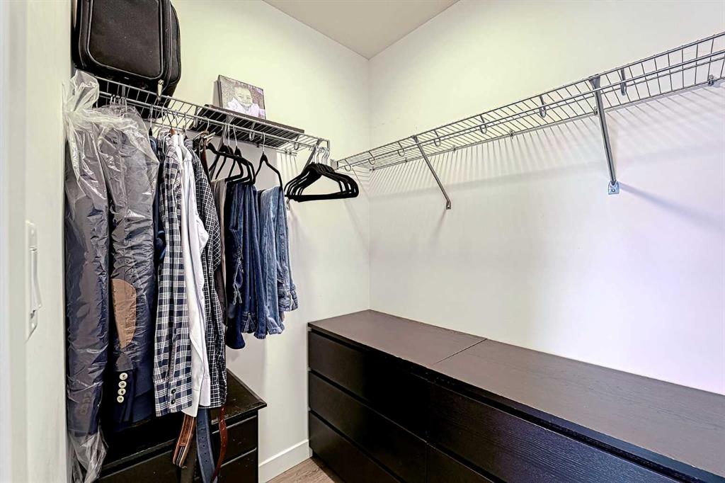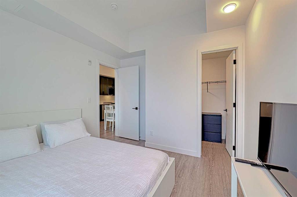 Live in one of Calgary\'s vibrant neighborhoods; UNIVERSITY DISTRICT! Everything you need at your fingertips; Restaurants, Pubs, Entertainment, Shopping Mall, Parks, Hospitals, etc... This clean, like new, TOP FLOOR unit has luxurious interior finishes, 10 ft high ceilings (only available on the top floor), private covered balcony that\'s great for year around use, titled parking stall (#21) located close to the elevator, a storage unit (#141) is just across the hall from the unit\'s door, and a fitness facility on the same floor as the unit. This home\'s open floor plan combines modern style with comfort; ample storage, stainless steal appliances, gorgeous grey cabinetry, beautiful easy to maintain vinyl plank flooring, the list goes on. The spacious bedroom has a large window and a walk-in closet. The 4-piece bathroom boasts a deep tub (upgraded) and large mirror. The in-suite laundry room has stacked washer dryer with space for storage. The patio is welcoming and covered and there is A/C rough-in. Invite your family and friends to enjoy the common terrace with picnic tables and BBQs or use the meeting rooms that are conveniently located on the 2nd floor of the building. This is a premium location for professionals and students in the area. Enjoy the community parks, outdoor skating rink, shops, restaurants, dog park, and so much more. This unit is move in ready! Let\'s make it your new home!