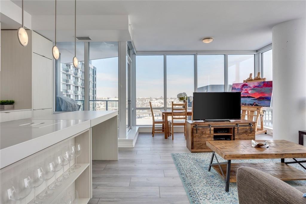 OPEN HOUSE SUNDAY JAN 11th 2-4pm! Welcome home to this beautiful suite at The Verve, one of East Village’s most desirable concrete buildings by FRAM + Slokker. This freshly painted 2-bedroom + flex, 2-bath residence offers a rare blend of modern design, full-service amenities, and breathtaking Bow River and city views. Step inside to a bright, open-concept layout featuring 9’ ceilings and expansive floor-to-ceiling windows that flood the home with natural light and frame spectacular skyline and river vistas. Wake up to glowing sunrises and watch the city come alive from the comfort of your own home. The Euro-inspired kitchen is both sleek and functional with quartz countertops, stainless steel appliances, and a large eat-in island perfect for everyday living or entertaining. The primary suite features a private ensuite, while the second bedroom and versatile flex space provide ideal options for guests, a home office, or creative studio. Oversized tiled bathrooms, in-suite laundry, and a spacious balcony with gas BBQ hookup add comfort and convenience. Life at The Verve is elevated by exceptional concierge service, secure entry, underground titled parking, additional storage, visitor parking and bike storage, along with an exceptional collection of resident amenities. Enjoy the fully equipped fitness studio, entertain in the stylish resident lounge and party room with kitchen, or unwind in the beautifully landscaped courtyard gardens on the 6th floor. Take in exceptional views of Calgary’s skyline from the rooftop observation deck on the 25th floor, a true standout feature. Located in the heart of East Village, you’re steps from river pathways, St. Patrick’s Island, Prince\'s island, National music center, Studio bell, the New Central Library, Dog Park, pickle Ball court , cafés, restaurants, boutiques, and grocery stores, with the C-Train just blocks away and quick access to Inglewood, Kensington, Saddledome and Stampede Park. Offering a care free life style, high walkability score and access to cultural venues. This is effortless inner-city living that is stylish, connected, and surrounded by everything that makes downtown Calgary thrive.
