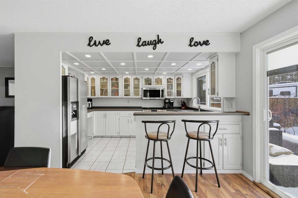 The white-painted oak kitchen is bright and cheerful with a sunshine ceiling and loads of southern exposure. The peninsula gives you extra storage and counter space, plus a raised bar that’s perfect for hanging out with family and friends. The dining area features a built-in china cabinet and patio doors that open onto a huge back deck—great for entertaining. The patio doors are updated with built in blinds for a sleek and clean look. There is a back door which leads down to the dining room and third level and provides easy access to the back garage.