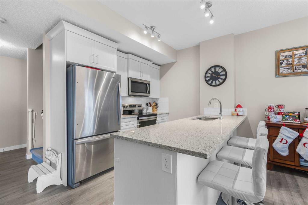 Welcome to this beautifully maintained townhome in the sought-after community of Fireside in Cochrane. Offering thoughtful upgrades at an affordable price, this home is the perfect blend of comfort, style, and convenience. The main level features wide-plank vinyl flooring and 9-foot ceilings that enhance the bright, open-concept layout. The gourmet kitchen is a standout, showcasing quartz countertops, white Shaker-style cabinetry, stainless steel appliances, and a spacious pantry. A large island provides plenty of room for meal prep and effortless entertaining. Natural light pours in through oversized windows and a sliding door that leads to your private balcony. A convenient half bath and laundry room complete this floor.