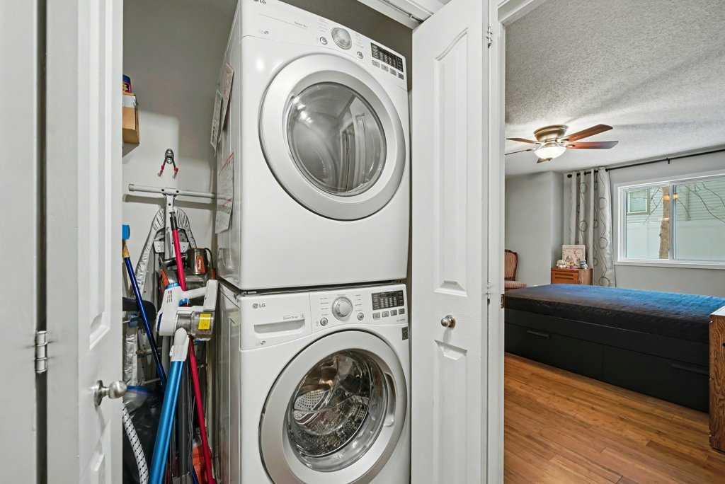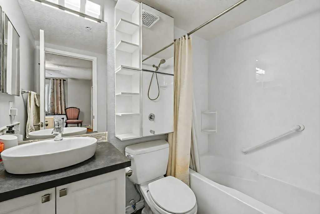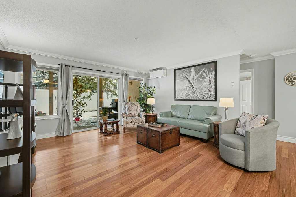 Impressively large condo that \"lives like a home\" - 1429 sq. ft. - and has been upgraded with high end finishings! Be welcomed as you enter the spacious foyer, adorned with engineered bamboo strand flooring. The open plan shows off the gourmet chef\'s kitchen, complete with an oversized granite island/counters, glass backsplash, light cabinetry and upgraded stainless steel appliances (*new induction range, new dishwasher and newer fridge)! The adjacent living room and dining room provide a perfect flow for entertaining. A unique open den area provides many options - family room/bonus room or work from home office space. Other features include: upgraded baseboards and crown moldings. The living room has plenty of space for entertaining family and friends. Enjoy effortless, stair-free living with the convenience of stepping directly from your living room onto your private patio - perfect for fresh air, easy pet access, and a seamless indoor-outdoor lifestyle! Both very large bedrooms feature new windows, mahogany custom California Closet organizers, air conditioners, remote bottom up / top down blinds. A 3 piece bathroom is located off the second bedroom, and the master bedroom features a 4 piece ensuite. A massive in-suite storage room is located next to the laundry - which has newer LG full sized washer and dryer. This home also includes 2 parking spaces and is located close to all amenities including: grocery, shopping, schools, golf, express transit to downtown and airport, future green line c-train station, public library, Vivo rec centre and more. Deerfoot & Stoney Trails are easily accessed.