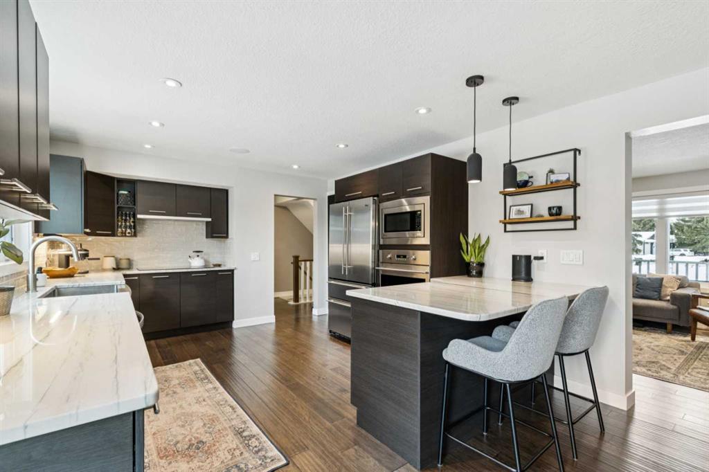 Situated on a large lot in Braeside and offering over 2,400 sq ft of finished living space, this 4 bedroom, 4 bathroom home is perfect for growing families looking for a quiet family friendly neighbourhood, close to schools and all amenities! The cool colour pallet and recessed lighting make this home nice and bright. Double pane windows, knockdown ceilings, built-in speakers and central air thru-out. The main floor has a large living room with gas fireplace that opens on the main dining area, hardwood floors, a 2 pc bath and mudroom (updated 2022) . The kitchen is well appointed with stainless steel appliances, breakfast bar, stainless steel apron front sink and tons of storage. The upper level has 3 nice sized bedrooms and a 4 pc bath. The primary is complete with large walk-in closet and ensuite with oversized walk-in shower. The basement was finished in 2022 complete with a 4th bedroom, 4 pc bath, laundry room and large rec room. A new radon system was installed in 2025. The huge NE facing back yard is perfect for outdoor living featuring a patio with pergola (2023) as well as a 2 level deck of the kitchen, perfect for grilling and entertaining. There is an oversized gate to utilize the backyard space for additional parking. There is a single attached front drive garage and driveway with room for 2 additional vehicles. Close to the Canyon Meadows & Willow Park Golf Courses, Fish Creek and Tazo Costco, steps to Braeside off leash area & easy access to 14 St, Anderson Rd and Stoney Trail Ring Road. Minutes to Rockyview General Hospital & Chinook Centre.