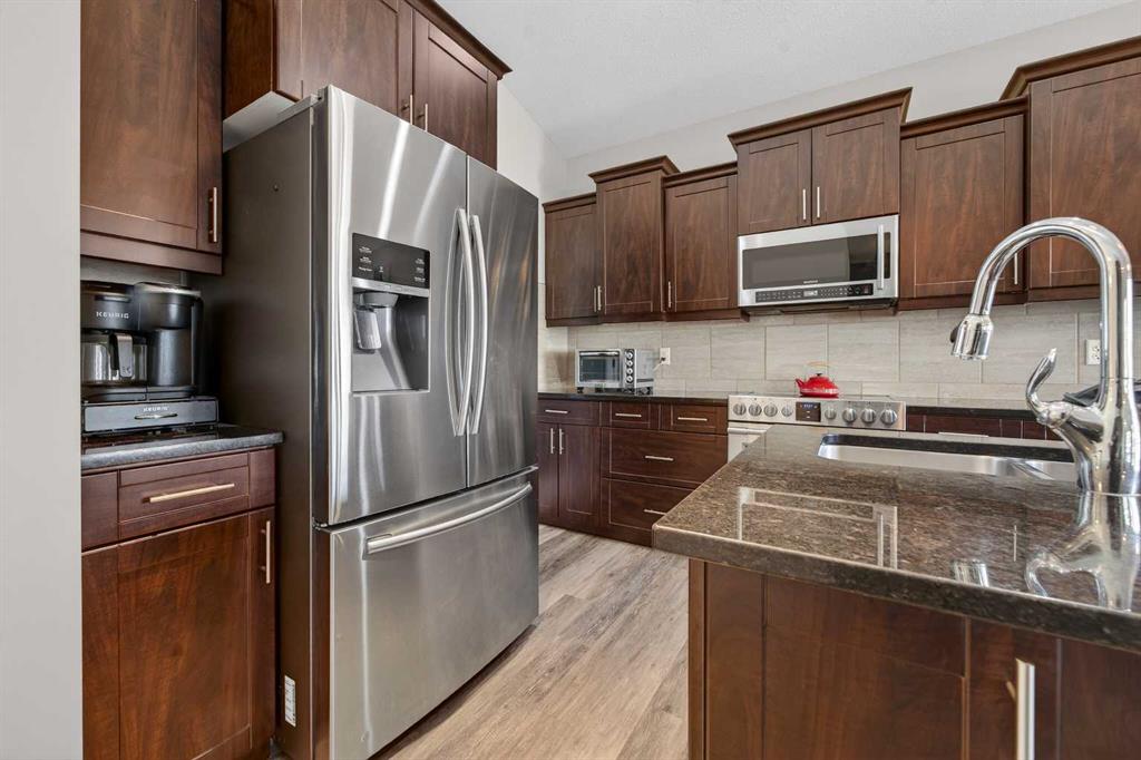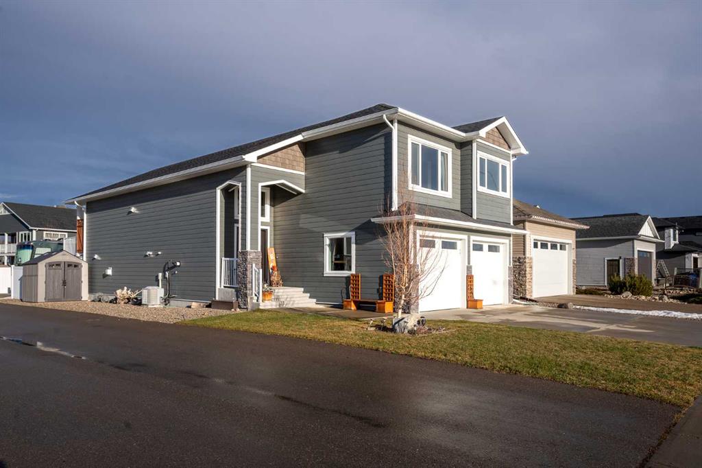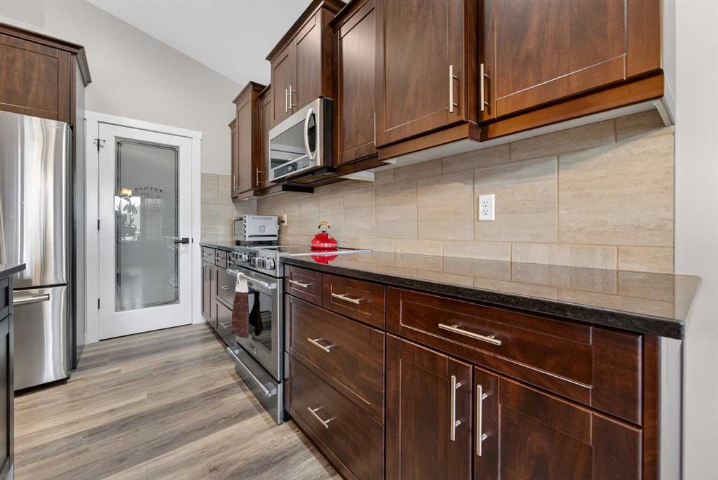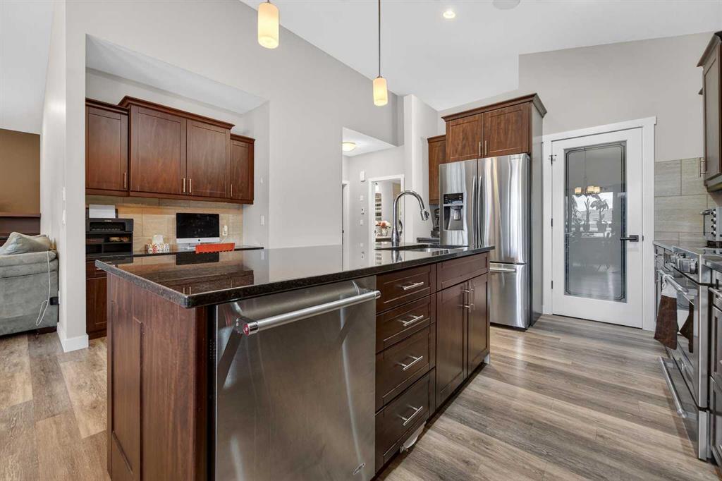 This fully developed 1,800 square foot modified bi level offers a thoughtfully designed layout with five bedrooms and excellent flexibility for families, multi generational living, or future rental income. Spacious, well laid out, and filled with natural light, this home balances everyday comfort with smart functionality. Vaulted ceilings and an open concept main floor create an inviting sense of space as soon as you step inside. The living room is warm and welcoming, centered around a gas fireplace with a stone surround and built in cabinetry that adds both character and storage. Just off the living area, the dining space is flooded with natural light from a large picture window and opens directly onto the backyard deck, making it ideal for entertaining or relaxed family meals. The kitchen is designed to impress and perform, featuring dark cabinetry, granite countertops, high end stainless steel appliances, and a massive walk in pantry that offers exceptional storage. Two spacious bedrooms are located on the main floor, while the private primary suite sits above on its own level, creating a true retreat. This space includes a five piece ensuite with dual vanities, a deep soaking tub, and a large walk in closet, with the convenience of the laundry room located on the same level. Downstairs, the home is already set up with an illegal suite in mind, offering excellent rental or multi generational living potential. The lower level includes a second kitchen, a large living area anchored by a second gas fireplace, two generously sized bedrooms, and a five piece bathroom with dual vanities. A separate laundry area is located in the utility room, and the walk out entrance adds even more flexibility. With the simple addition of a door or wall, the spaces can be fully separated, or kept open to enjoy the home as one expansive living space. Outside, the property is further enhanced by an additional 16 by 20 parking pad at the rear, providing extra off street parking or the potential for a future second garage. With its flexible layout, thoughtful design, and built in potential, this is a well rounded home that offers space, comfort, and options for today and the future.