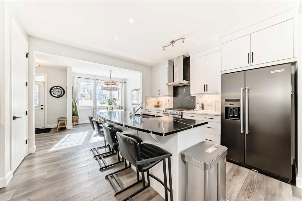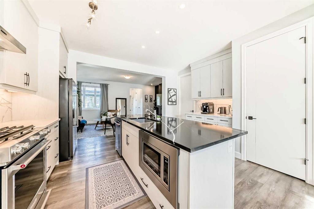 Step inside to a bright, OPEN-CONCEPT main floor featuring 8-FOOT DOORS, upgraded 5.5\" baseboards, and stylish trim throughout. The chef-inspired kitchen includes FLOOR-TO-CEILING CABINETRY, premium KitchenAid STAINLESS STEEL APPLIANCES, a large island, with QUARTZ COUNTERTOPS, Silgranit sink, and a built-in COFFEE BAR with PANTRY—ideal for everyday living and entertaining.