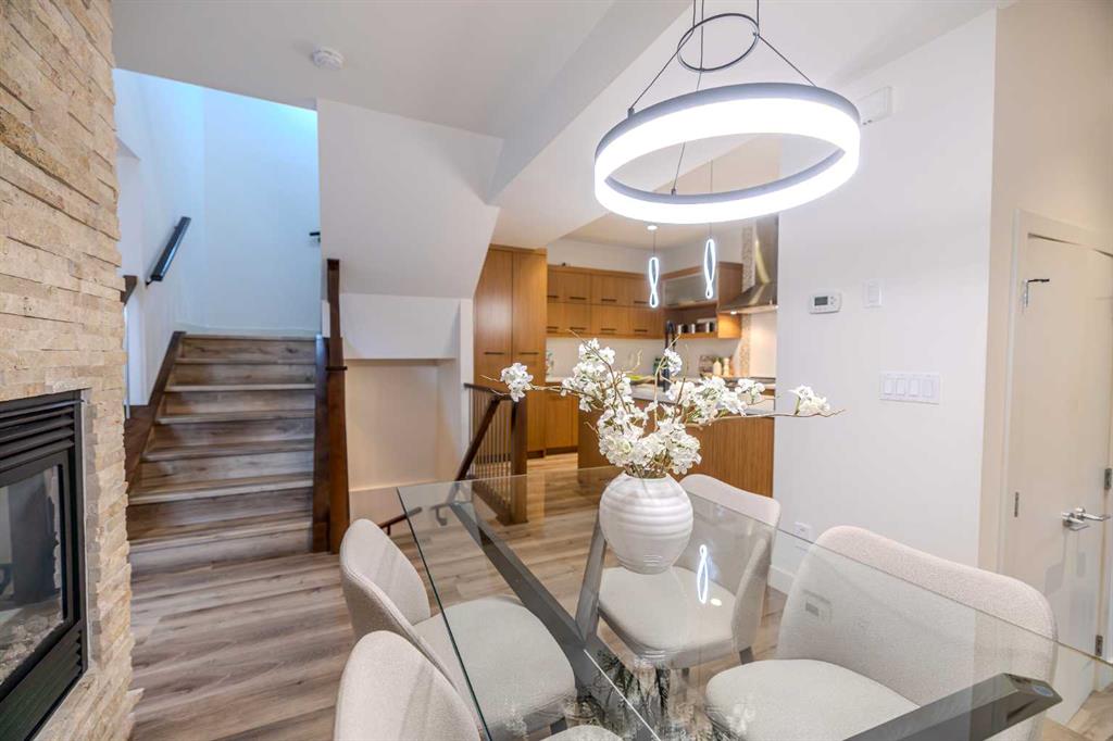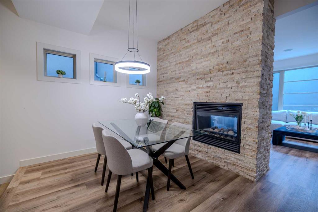 Fully developed basement with a large third bedroom, 4-piece bathroom, and second living room—ideal for guests or a home office. Recent updates include new flooring, fresh paint, and updated light fixtures. Features include a double-sided fireplace between the living and dining rooms, quartz countertops, gas range, stainless steel appliances, and ample storage.