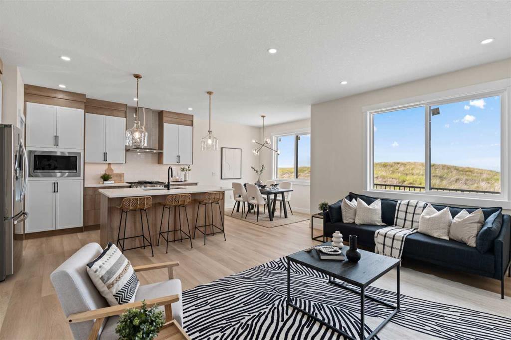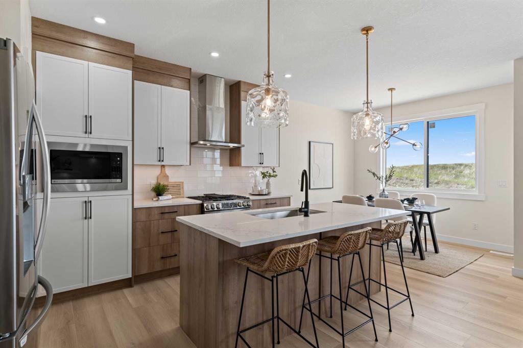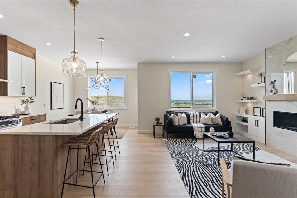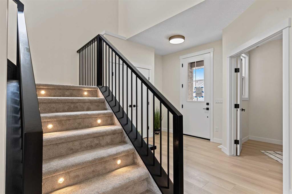 Welcome to our latest Exquisite SHOWHOME in the town of Crossfield. Just 10 minutes north of Airdrie, 25 minutes from Calgary and 3 minutes off highway 2. This 2050sqft heavily upgraded home consists of 3 bedrooms, 2.5 bathrooms with bespoke finishings such as maple wood detail, shaker with plywood cabinet boxes, black exterior dual pane windows, high end lighting, montigo natural gas fireplace feature, quartz countertops, upgraded black plumbing fixtures with freestanding tub, upgraded black hardware, wide plank Lvp flooring with a drywalled/insulated garage. Exterior also includes beautiful stucco/stone finishes. Full finishes can be provided upon request. Additional features include a large WALKOUT lot, 9FT CEILINGS on all floors, Open concept design, separate entrance, completed landscaping, basement roughed in with plans included. Exterior landscaping to be completed concrete wrapped around to rear patio is included. Spend sunny afternoons in the towns parks and playgrounds such as Veterans peace park or checkout the Crossfield Farmers market, the annual demolition Derby, the Rodeo grounds. This rapidly growing town also has amenities such K-12 schools such as Crossfield elementary school and W.G. Murdoch School, which are just short walk away! Find your forever home in this beautiful serene town with connectivity and affordable prices, you\'ll wonder why you didn\'t move sooner! Home is almost complete with final finishes/touchups and exterior landscaping remaining.