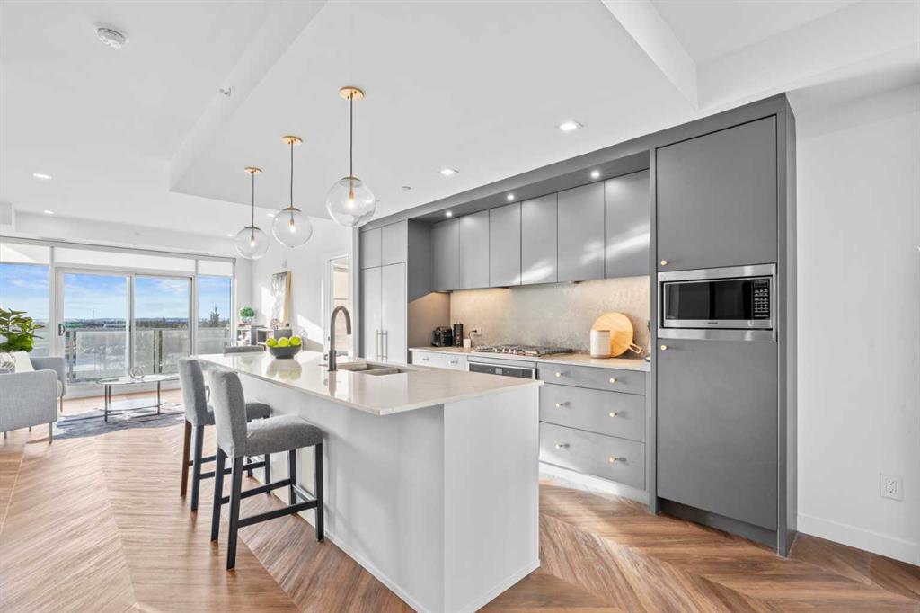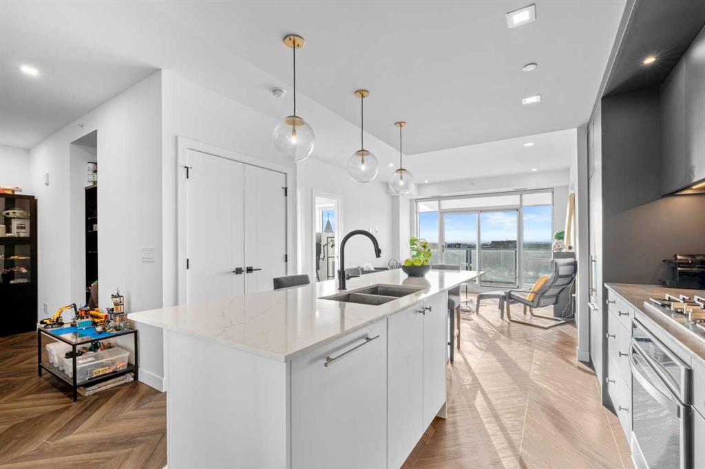 Welcome to Gateway West II – the epitome of urban elegance in West Calgary. This refined residence boasts an enviable location, featuring unobstructed mountain views and a spacious balcony. Nestled in one of Calgary\'s most sought-after neighborhoods, you’ll find yourself mere steps from acclaimed dining establishments such as Fergus and Bix, Mercato, Blanco, and UNA. Families will appreciate the proximity to prestigious schools, including Saint Joan of Arc, Waldor, Calgary French and International School, and Rundle, while everyday conveniences like Co-op and other grocery stores are within easy walking distance. Spanning over 1,000 sq ft, the thoughtfully designed open-concept layout includes 2 generous bedrooms and 2 luxurious bathrooms, one of which is a spa-like ensuite. The chef-inspired kitchen caters perfectly to culinary aficionados, complemented by a versatile flex den/dining room space for seamless entertaining. Crafted with high-end finishes and premium appliances, this residence is well-suited for young professionals, growing families, and discerning investors alike. Enjoy effortless access to downtown, the Rocky Mountains, and Stoney Trail, ensuring a harmonious blend of convenience and stunning natural beauty. Additional features include central AC and titled underground parking. Take advantage of amenities such as the Lobby Concierge service, a party/event room, roof top patio, and secure underground visitor parking. Seize the opportunity to claim this extraordinary property and elevate your living experience in Calgary!