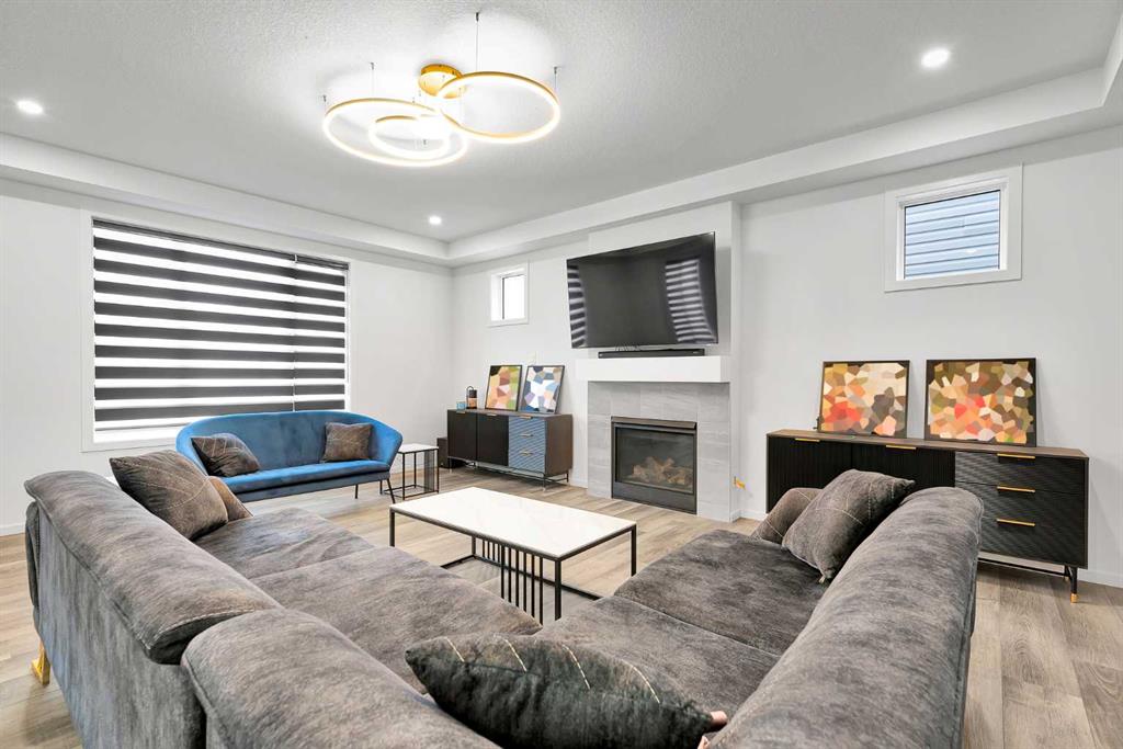 Step inside and be greeted by a bright, open-concept main floor featuring 9FT CEILINGS and VINYL PLANK FLOORING. The stunning kitchen impresses with QUARTZ COUNTERTOPS, a HERRINGBONE TILE BACKSPLASH, BLACK STAINLESS STEEL SMART FRIDGE, WALK-IN PANTRY, and a large ISLAND WITH SEATING—perfect for casual dining. The spacious living room with TRAY CEILING centers around a TILED GAS FIREPLACE WITH A MODERN MANTEL, while the adjacent dining area features PATIO DOORS TO THE DECK -ideal for BBQs and A SUNNY WEST-FACING BACKYARD.