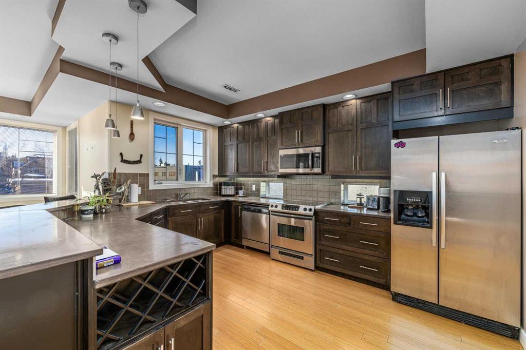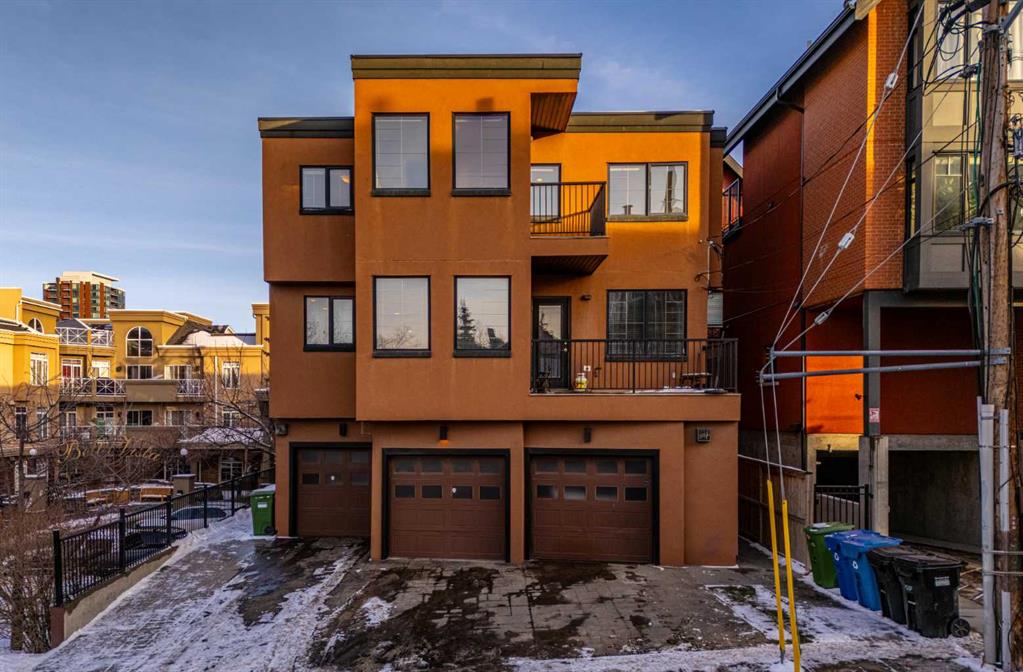 This spacious and unique 3-storey executive townhouse is quietly positioned in the heart of Bankview, offering an exceptional 10/10 inner-city location just steps from the energy, dining, and nightlife of 17th Avenue SW and the everyday convenience of 14 Street SW. Walk everywhere, commute downtown in minutes, and enjoy being surrounded by Calgary’s best cafés, shops, transit routes, and entertainment, all while still feeling tucked away and residential. This is true urban living done right. This home confidently leans into what makes it exceptional: two fireplaces, two balconies, and two skylights, a thoughtful combination that brings warmth, architectural interest, and incredible natural light throughout. From the moment you enter, you’re welcomed by a spacious front foyer with mudroom-style functionality and generous storage, creating a practical and polished arrival experience. Head up one level and the property continues to surprise. The wide open-concept main living area flows effortlessly, wrapped in windows and enhanced by tall ceilings that create a bright, airy atmosphere across all levels. Designed for both comfort and connection, the main floor features hardwood flooring and a striking two-way fireplace with custom built-ins anchoring the living and dining spaces. The contemporary kitchen is finished with stainless steel appliances, concrete countertops, and a functional breakfast bar. A private west-facing balcony off the living room extends the space outdoors, perfect for morning coffee or evening unwinding. Completing this level is a convenient and well-located half bath, ideal for guests and everyday living. The upper levels continue the home’s thoughtful design and flexibility. As you head upstairs, you’re greeted by a beautiful skylight that fills the space with natural light, complemented by oversized windows throughout that create a bright, open atmosphere. The primary suite is a true retreat with its own fireplace, dual closets, and a spa-inspired ensuite featuring double sinks, a soaker tub, steam shower, and an additional skylight that brings in even more sunshine. A generous second bedroom is paired with a versatile flex room, ideal as a home office, fitness area, or third bedroom, opening onto a southwest-facing balcony for added light and outdoor connection. A full upper-level main bathroom and conveniently located laundry complete this level, rounding out a layout that’s both functional and beautifully designed. Currently tenanted, this property offers a strong opportunity for investors seeking a turnkey inner-city rental, while also appealing to buyers looking to make it their own. With downtown minutes away, quick access along 14th Street, and a vibrant entertainment district nearby, this location supports long-term demand and lifestyle appeal. Add low-maintenance living, low condo fees, and true lock-and-leave convenience, making it ideal for busy professionals, frequent travelers, and hands-off investors alike. Book a tour today!