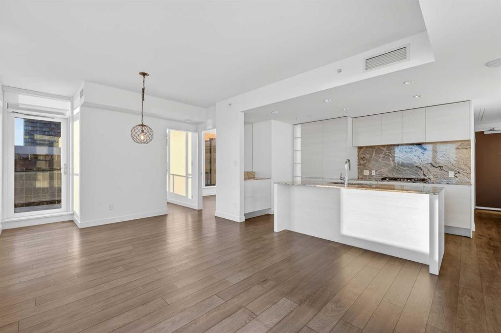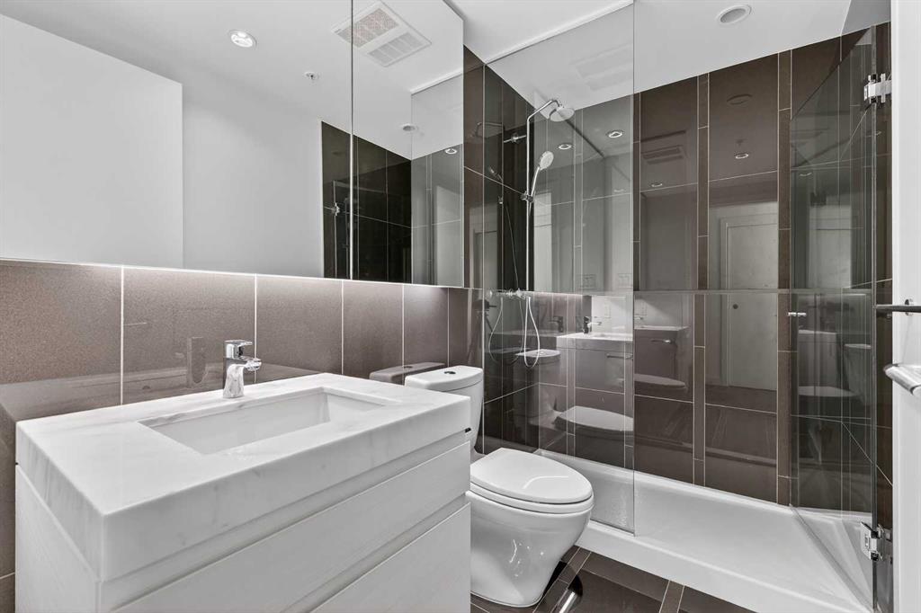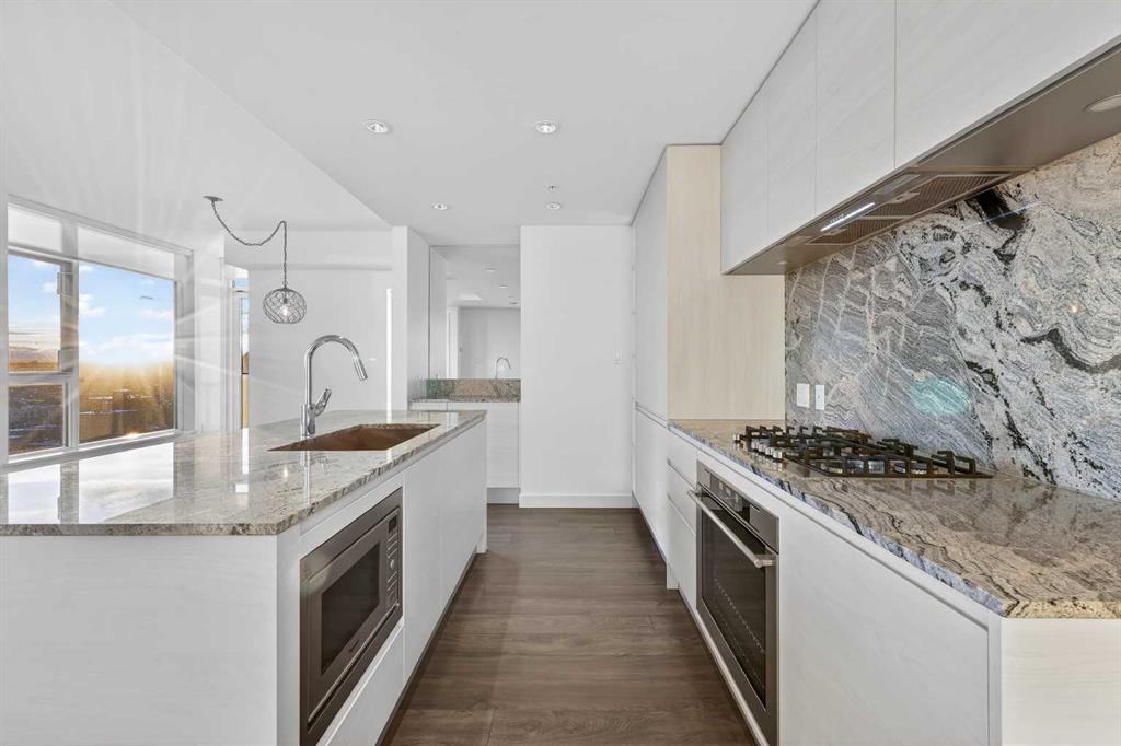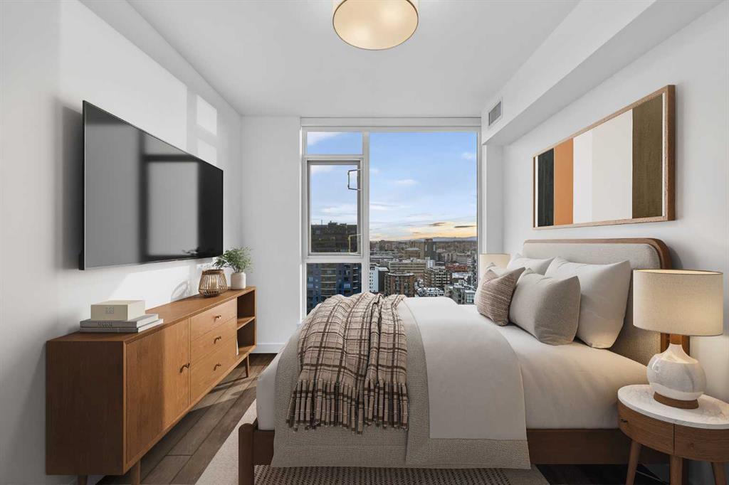 Unobstructed. Elevated. Exceptional. Perched high on the 16th floor, this premium corner end unit delivers breathtaking, fully unobstructed views of the city skyline, Memorial Park, and the Rocky Mountains. Floor-to-ceiling windows and 9-foot ceilings flood the home with natural light, creating an elevated, airy feel throughout. The sleek open-concept layout features granite countertops, a large central island, integrated high-end appliances, and air conditioning—perfect for both everyday living and entertaining. The living and kitchen areas flow seamlessly, offering flexibility for relaxing, dining, or working from home. The spacious primary suite is a standout offering uninterrupted park views, room for a king-sized bedroom set, and a LARGE walk-through closet leading to a rare, oversized 5-piece ensuite with double vanity, glass-enclosed shower, and deep soaker tub. A bright well sized home office adds versatility, while the second bedroom captures striking west-facing mountain views. Enjoy summer evenings on the private balcony with BBQ hookup, plus the convenience of **titled heated underground parking**, assigned storage locker, and a car wash bay. Park Point offers resort-style, pet-friendly amenities including 24-hour concierge and security, owner’s lounge with fireplace and kitchen, guest suite, fitness centre, yoga studio, sauna, steam room, Zen garden, fire pit, dog wash, bike storage with wash station, and more. Steps to the Elbow River pathways, tennis and pickleball courts, 17th Avenue shops and dining, and minutes to downtown, the +15 system, and the Calgary Public Library.