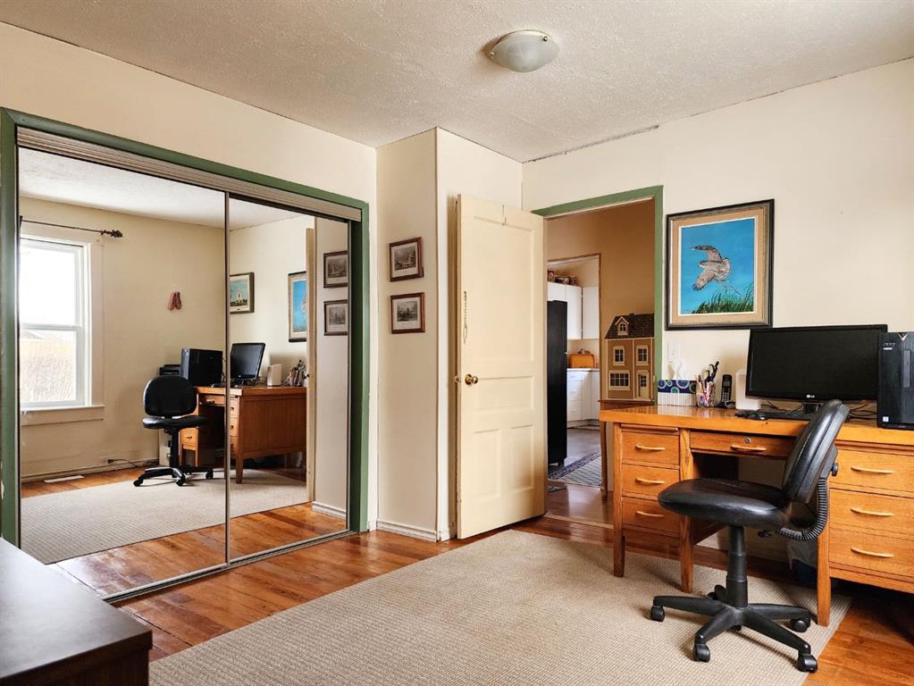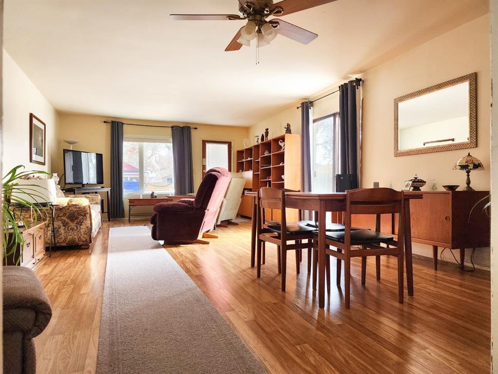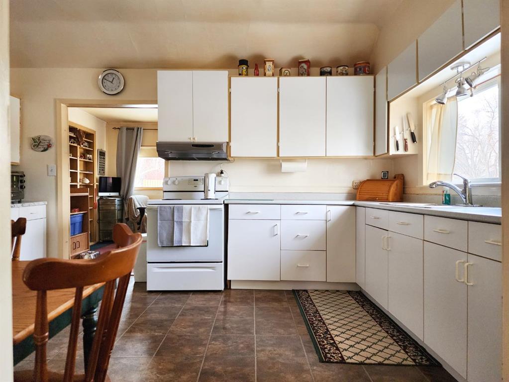 Step inside to a bright and spacious living and dining area featuring a charming built-in china cabinet. The kitchen offers white cabinetry and a cozy dining area, perfect for everyday meals. Just off the kitchen are two well-sized bedrooms and a four-piece bathroom. The main level is completed by a large laundry, boot, coat, and storage room conveniently located off the back entrance.