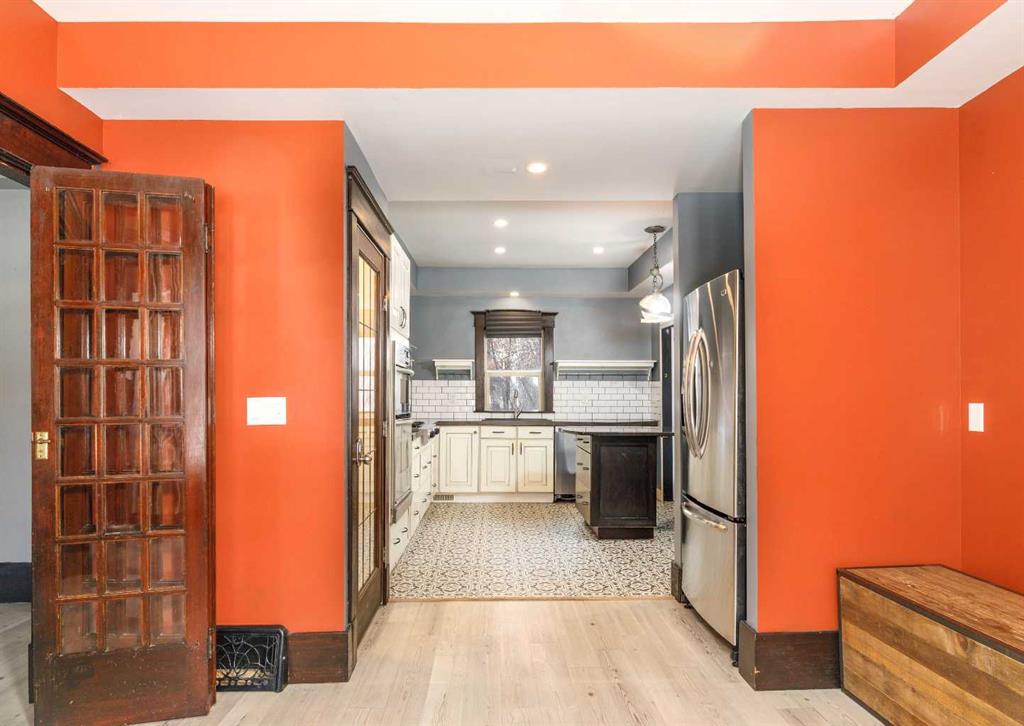 A spacious foyer welcomes you inside, where original glass-pane folding doors open into a warm and inviting Living Room enhanced by built-in bench seating and a striking fireplace. The Kitchen offers a gas range stove, generous cabinetry, and excellent functionality for everyday living and entertaining.
