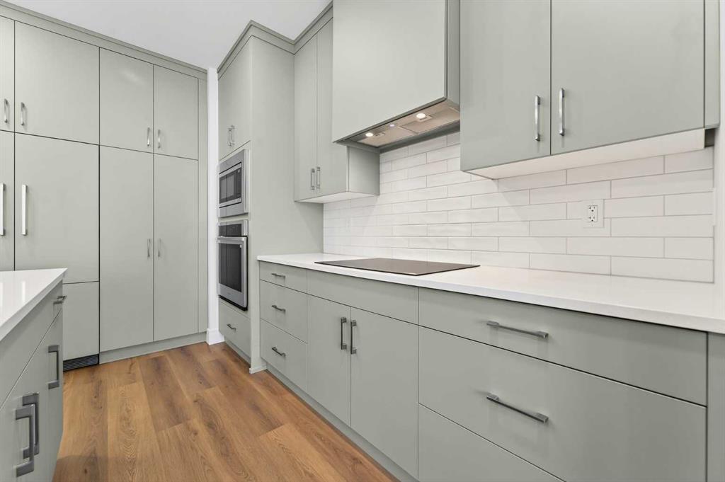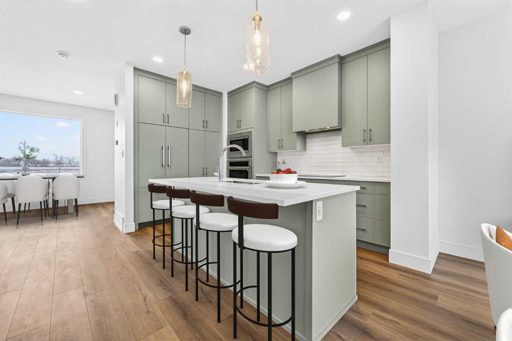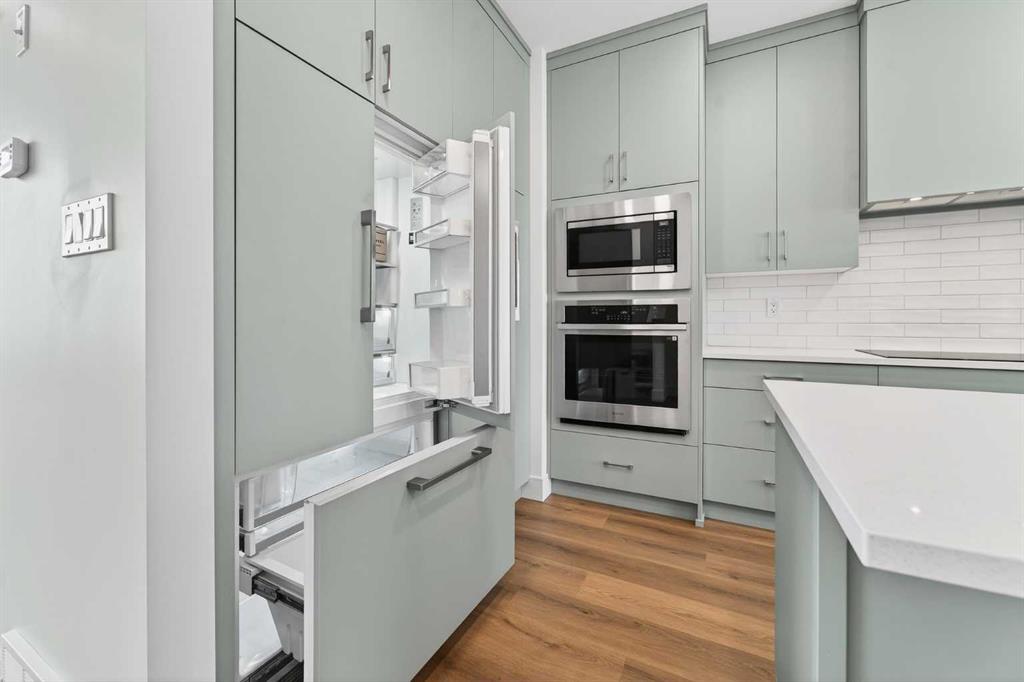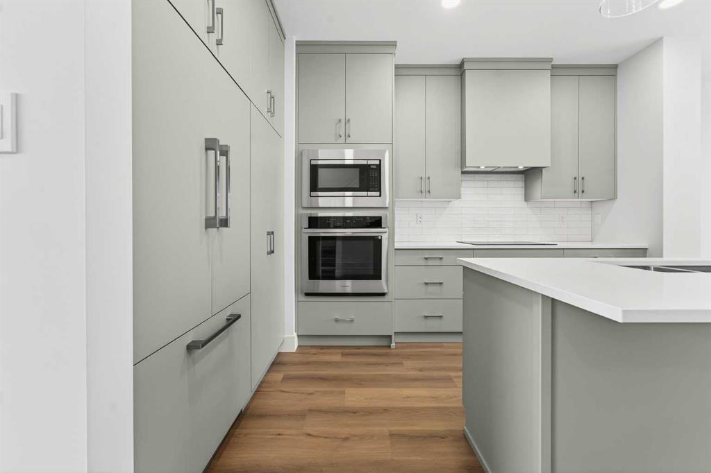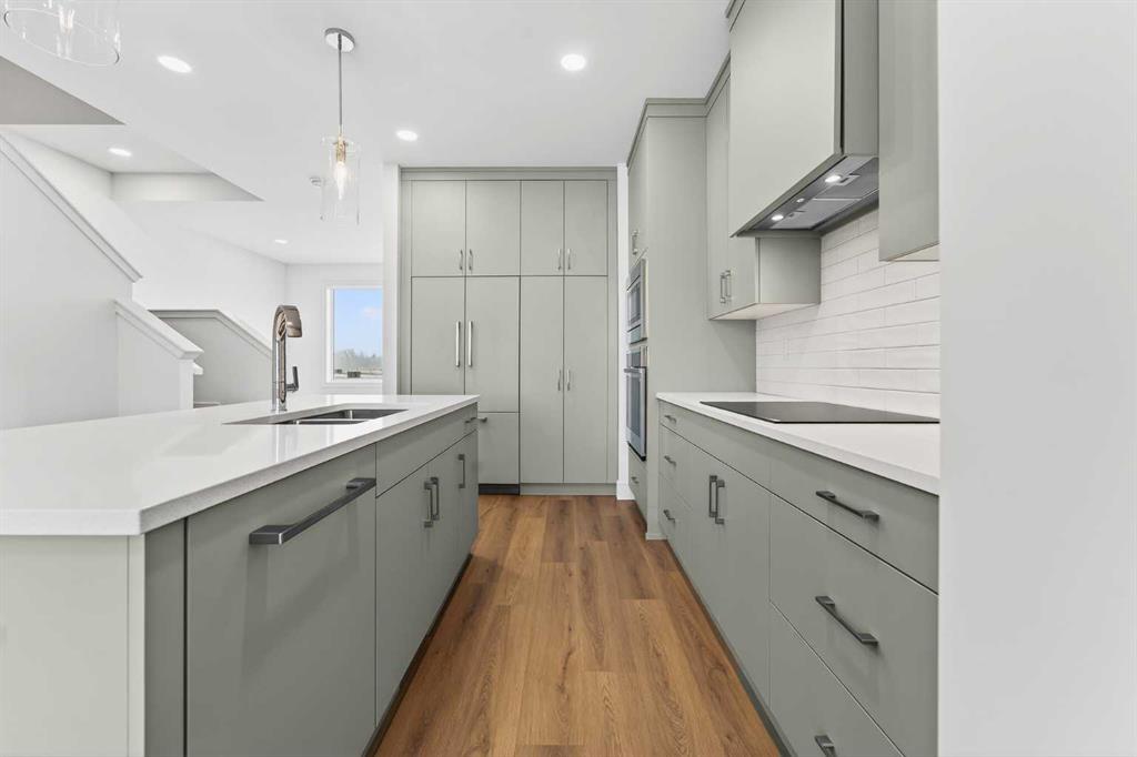 The main floor offers an open-concept living and dining area filled with natural light from oversized windows. The kitchen is finished with quartz countertops and Stranville Living’s signature appliance package, including a Fisher & Paykel panel-ready fridge seamlessly hidden within the cabinetry, a panelled dishwasher, and a sleek induction cooktop that gives the space a refined, contemporary feel.
