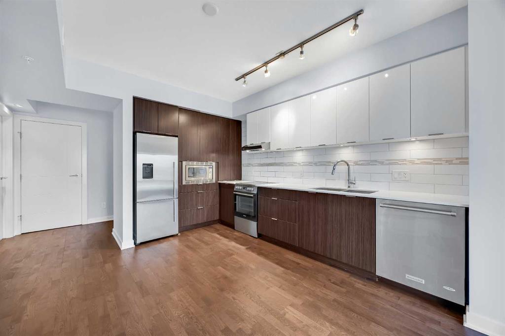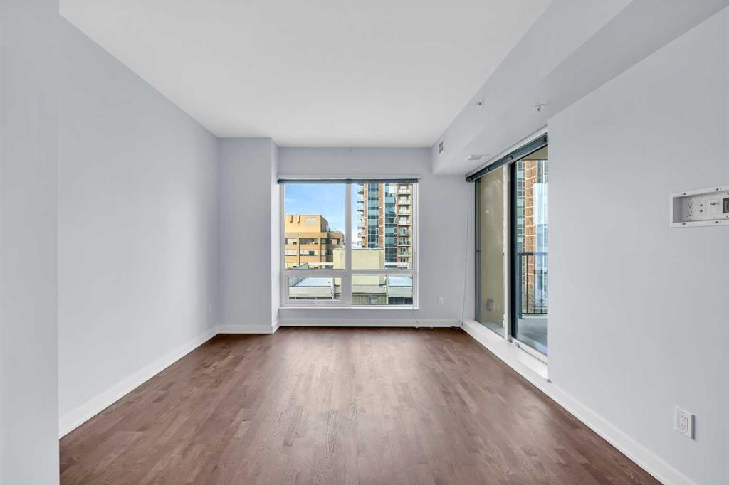 Set high on the 11th floor of Vogue, this refined 1 bedroom + den /1 bathroom residence offers an exceptional downtown living experience with contemporary finishes. The OPEN-CONCEPT LAYOUT showcases a sleek modern kitchen with quartz countertops, generous cabinetry and stainless-steel appliances, seamlessly connecting to a bright living space finished with HARDWOOD FLOORING—ideal for both relaxed living and elegant entertaining. The SEPARATE DEN provides a versatile space for a home office or additional storage, while the SPACIOUS BEDROOM comfortably accommodates a queen or king-sized bed and features a WALK-THROUGH CLOSET leading to the ensuite bathroom. Additional highlights include AIR CONDITIONING, a private balcony, a secured underground PARKING STALL and a STORAGE LOCKER. Access to PREMIUM AMENITIES including a rooftop fitness centre, owner’s lounge, games room, professional boardroom, SECURE VISITOR PARKING and full concierge service. Located in the heart of downtown, this suite offers EXCEPTIONAL WALKABILITY with immediate access to the Bow River pathways, Prince’s Island Park, the C-Train and Calgary’s +15 network.. A fantastic opportunity for individuals, couples, or investors seeking quality, convenience and the welcoming spirit of a vibrant community!