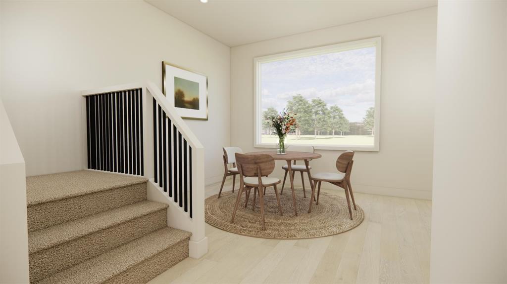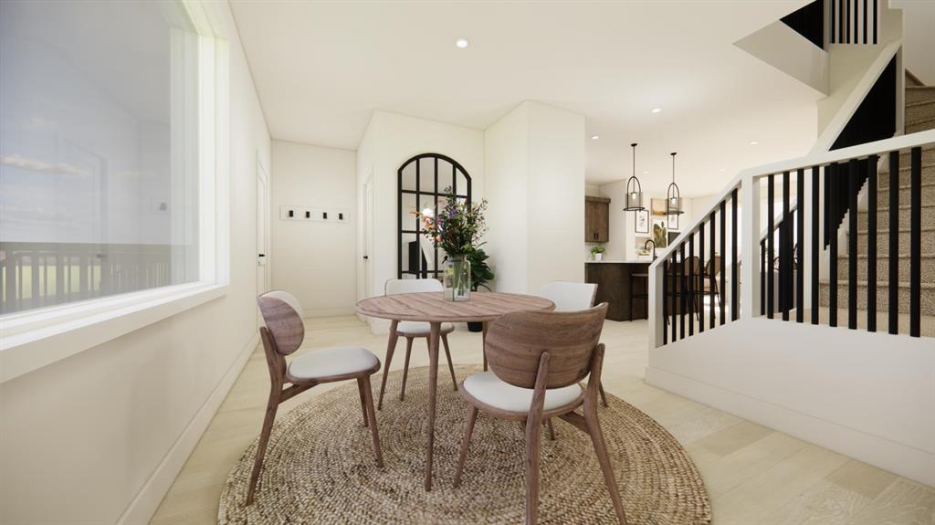 The main floor is designed for everyday living and entertaining, featuring an open-concept layout filled with natural light from oversized windows. The spacious living room flows seamlessly into the functional kitchen, complete with quartz countertops, soft-close cabinetry, and a central island with bar seating that anchors the space. Toward the back of the home, the formal dining area overlooks the backyard and double car parking pad, creating a practical and comfortable setting for family dinners or hosting friends.