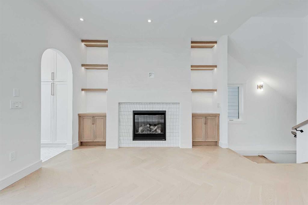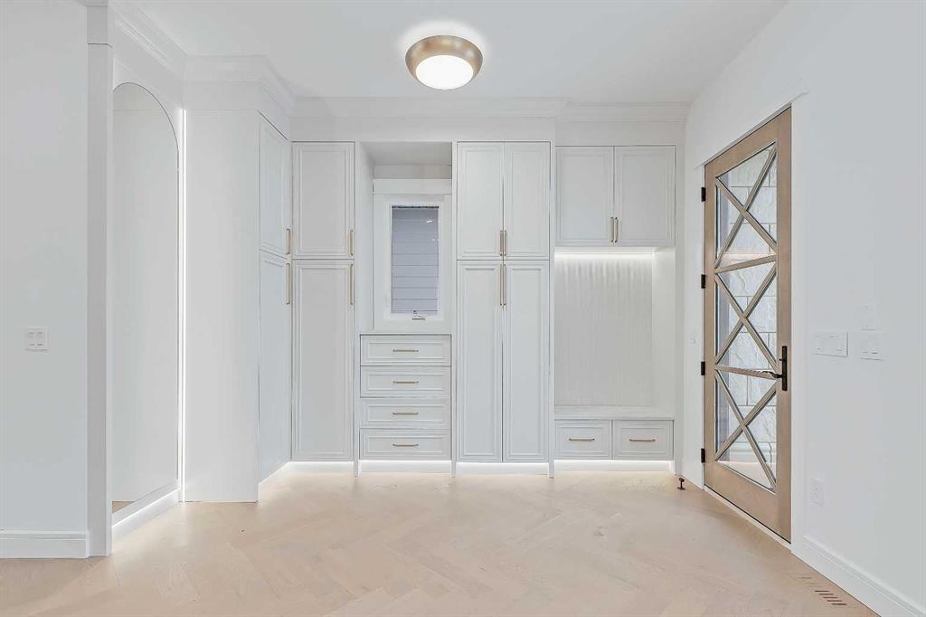 Inside, you\'re greeted by a central foyer that opens into a bright, airy space with soaring ceilings and oversized windows that let in light from every angle. The dining area connects naturally to a chef-inspired kitchen past a convenient bar area with space for a beverage fridge and custom cabinetry, while the kitchen itself impresses with a full-height quartz backsplash, designer pendants, and upgraded high-end appliances, including a gas range, custom hood fan, and French door fridge/freezer. The spacious living area feels open yet cozy, grounded by a GAS FIREPLACE with built-in shelving on either side and a view of the landscaped yard, with access to the custom mudroom with built-ins, adding the kind of functional polish that makes day-to-day life feel seamless.