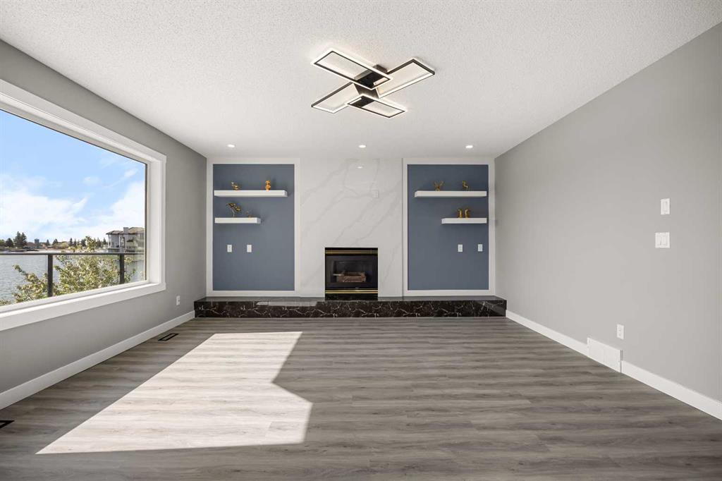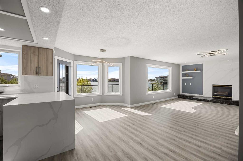 With stunning designer chandelier and large sunlit windows, the grand two-storey Living Room creates an airy and welcoming atmosphere upon entering. The connected elegant Dining Room is perfect for accommodating large family dinners or gatherings with friends. Walking to the back you will enjoy panoramic lake views in the family room with a gas fireplace featuring a quartz surround and deco wall. The spacious breakfast nook opens onto a full-width deck with aluminum railings and glass panels, offering clear sightlines and panoramic lake views. The Kitchen is appointed with quartz countertops, an eating bar, a pantry, and new stainless steel appliances, providing both functionality and style for everyday living. A main-floor Bedroom with a full bath complete this level, providing added flexibility for guests or extended family.