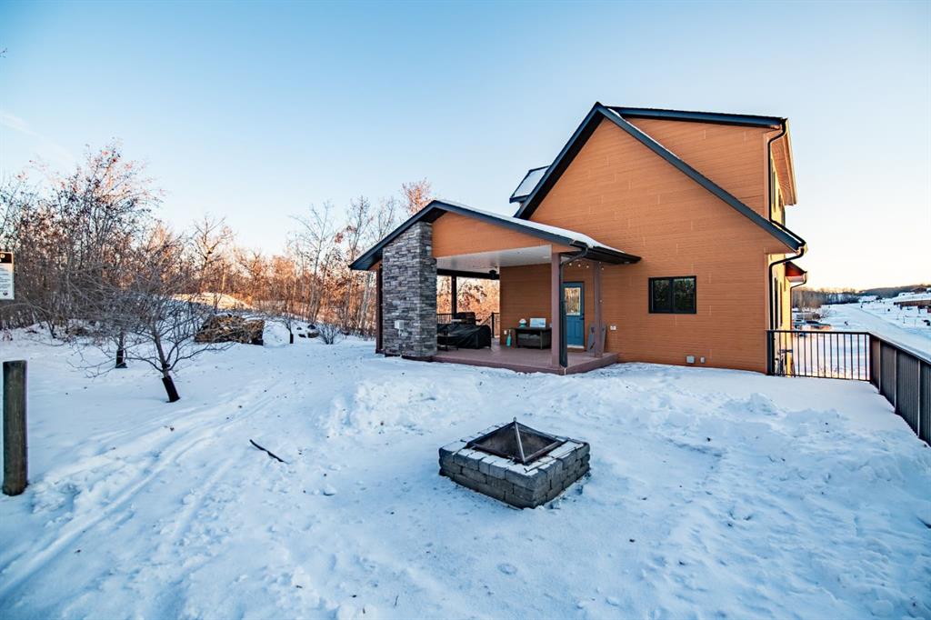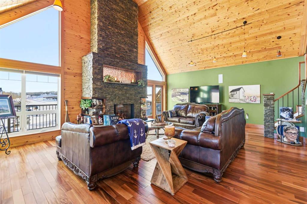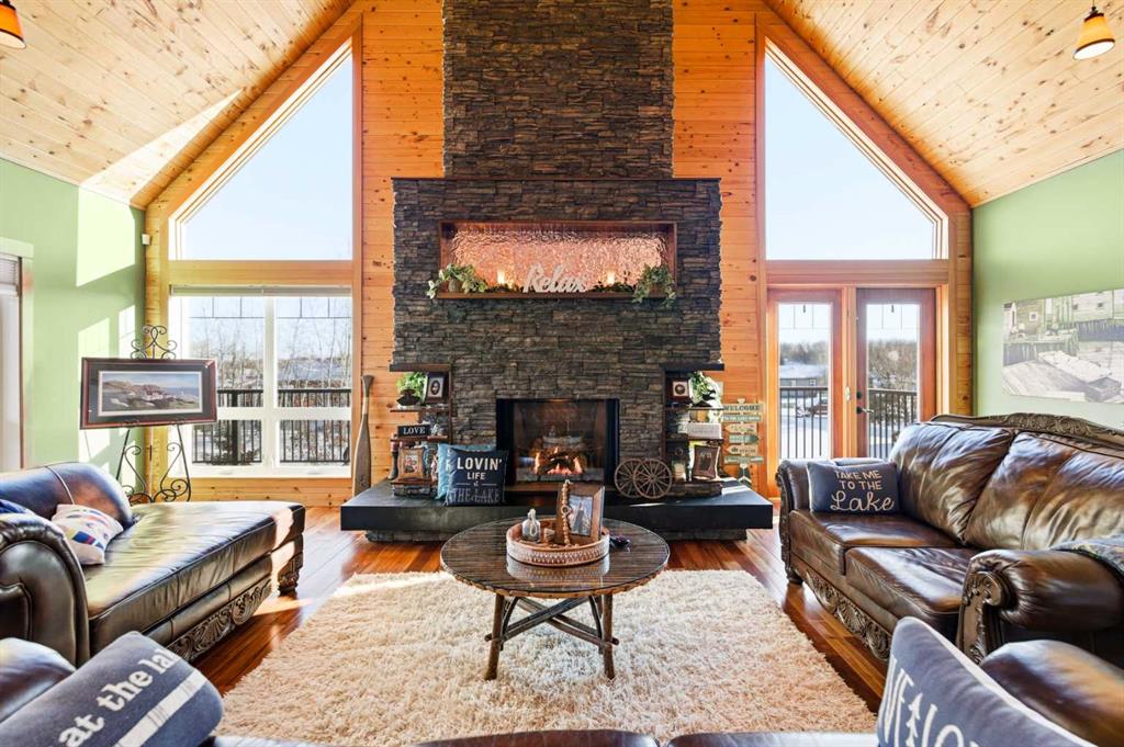 Located at one of Alberta’s largest lakes, Buffalo Lake is truly one of the area’s best-kept secrets. Welcome to Buffalo Sands, a close-knit lake community offering a four-season lifestyle ideal for weekend escapes, unwinding after work or full-time living. This exceptional lakehouse-inspired chalet is not an A-frame cabin, but a thoughtfully designed home with architectural character, warmth and timeless appeal. This beautifully maintained 1½-storey, fully finished home features a front walkout entry-level with 9’ ceilings and in-floor heating, offering comfort and practicality year-round. The attached double heated garage (12’6” x 33’6”) is fully finished, painted, wired and includes a floor drain, upgraded lighting, new electrical panel, and generator hook-up panel. Step inside to a welcoming tiled foyer with generous storage and a stylish 2-piece bathroom. A few steps up, the great room impresses with soaring 19’ vaulted ceilings, polished hardwood floors and a stunning floor-to-ceiling stone fireplace with copper insert, framed by stone pillars inside and out. Large windows flood the space with natural light and showcase tranquil views. The kitchen is designed for both everyday living and entertaining, featuring polished concrete countertops, a premium WOLF gas stove, stainless steel appliance package, corner sink, pantry, breakfast bar and a custom coffee station. Three doors provide seamless access to the massive three-sided wrap-around covered deck, perfect for hosting or relaxing outdoors. The primary bedroom offers a walk-in closet with built-in organizers and a spa-inspired ensuite with an upgraded steam walk-in tiled shower and glass doors. The upper-level loft overlooks the main living space and includes two additional bedrooms and a 4-piece bathroom—ideal for guests, family a library or office nook and direct access to a covered outdoor courtyard complete with a gas fireplace. The entry-level walkout features in-floor heat, a newly created recreation room/could be additional bedroom with plush carpeting, cabinetry and feature dart wall, a large utility/laundry room with epoxy flooring and extensive storage, workshop/boiler room. Outdoor features include multiple conversation areas a fire pit and maintenance-free decking with storage underneath. Recent upgrades include new WOLF stove, stainless refrigerator, Samsung washer/dryer, boiler, furnace and A/C unit, hot water tank, sound system (inside and out), lighting upgrades, paint, cabinetry refinishing, garage improvements, widened driveway, additional parking pad, landscaping/ new sod and stone enhancements. A unique highlight is the walking trail behind the home providing direct access to the lake, beach, docks, playgrounds, pond - skate, canoe or country ski on trails. The property includes the right to boat slip in the community marina (on separate title). Full time residence or your new income / rental escape! This is lake living at its finest-be prepared for love at first sight.