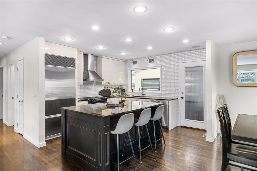 Truly one of a kind, this stunning home has been completely redesigned by acclaimed designer Martine Ast and was featured in Western Living magazine, showcasing a level of finish that rivals a luxury showhome. With over tons of upgrades, including newer and enlarged front windows, the bright upper level offers hardwood flooring and a seamless open-concept layout connecting the kitchen, living, and dining areas. The striking modern kitchen features custom cabinetry, a large working island with eating bar, and top-of-the-line appliances including a Sub-Zero refrigerator, with direct access to a large private south-facing deck. An additional side entry leads to an east-facing covered porch with access to the backyard and garage, while the upper level is completed by an open office area, two spacious bedrooms, and a 4-piece bath. Downstairs, upgraded railings lead to a large recreation room anchored by a custom gas fireplace and featuring a built-in wine rack, while the lower-level primary retreat offers a large dressing room with exceptional closet space and a spa-inspired 4-piece ensuite with heated floors. Additional highlights include custom storage under the stairs and upper landing, a new hot water tank, an oversized, insulated, and heated garage, and RV parking. Ideally located close to schools, parks, and shopping. Do not miss this gem.