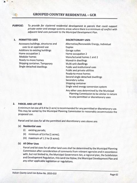 LOT 1. PRIMARY POWER LINES ARE IN !!!! Here is your chance to bring your ideas and purchase your very own acreage lot. With the Grouped Country Residential zoning it will give you numerous options under the permitted and discretionary uses. There are very limited acreage lots available at this size and price. At just under 5 acres the possibilities are endless. For the naturalists these lots still contain untouched prairie wool grasses. The County of Vulcan has been a gem to deal with as well as the inspectors making the development process straight forward. Call your favorite agent today and lets discuss options!!!