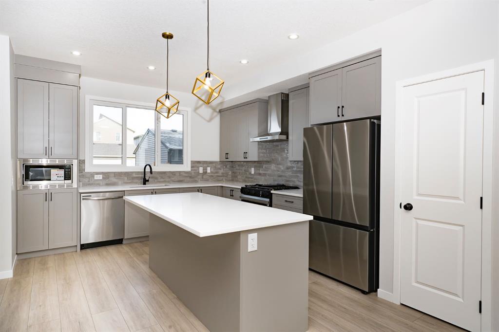 The main floor features 9-foot ceilings, luxury vinyl plank flooring, and a bright open-concept layout, perfect for everyday living and entertaining. The chef-inspired kitchen is complete with quartz countertops, extended upper cabinetry, stainless steel appliances, a built-in microwave, a chimney hood fan, and a knock-down ceiling finish.