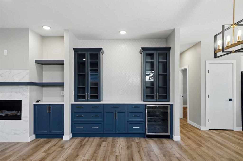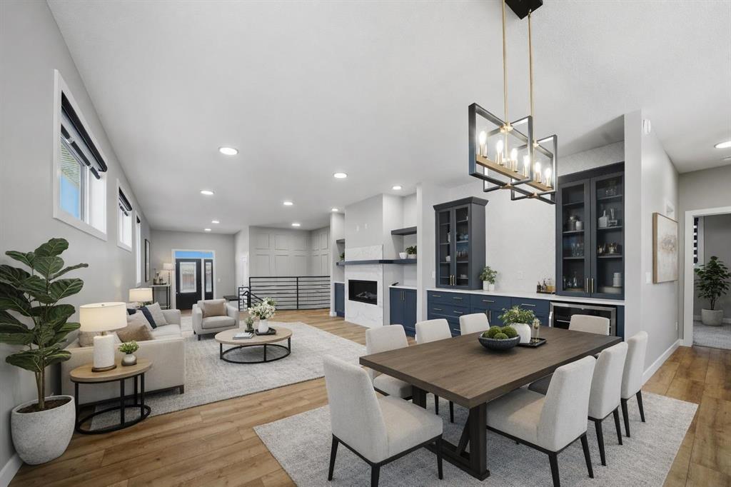 A grand entry greets you and your guests with high ceilings, a custom built-in bench, dual coat closets- a welcoming space for all. Flow into the living room anchored by a custom feature wall with cabinetry, floor outlets for furniture arrangement simplicity, a gas fireplace, tv wall, allowing for the perfect space to enjoy laughter, conversations, and quiet moments.