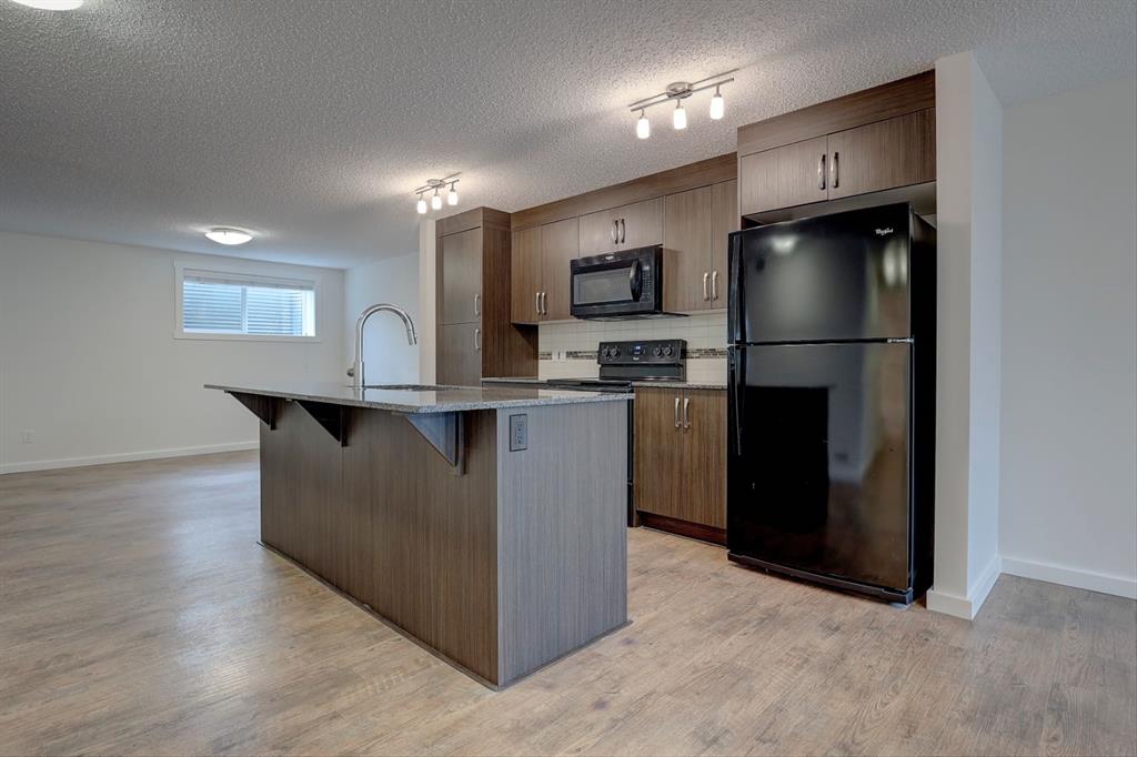 The open-concept kitchen is equipped with quartz countertops, sleek black appliances, a central island, pantry and plenty of cabinet storage—perfect for cooking and hosting. The dining space easily accommodates a full-sized table with room to spare.