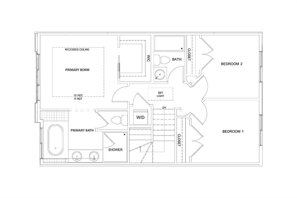 Upstairs, the home feels bright and airy with a skylight bringing in natural light. The primary suite offers a true retreat with a recessed ceiling, walk-in closet and a spa-inspired ensuite featuring a double vanity, freestanding tub, and glass walk-in shower. Two additional bedrooms, a full bathroom, and upper-level laundry complete this functional layout.